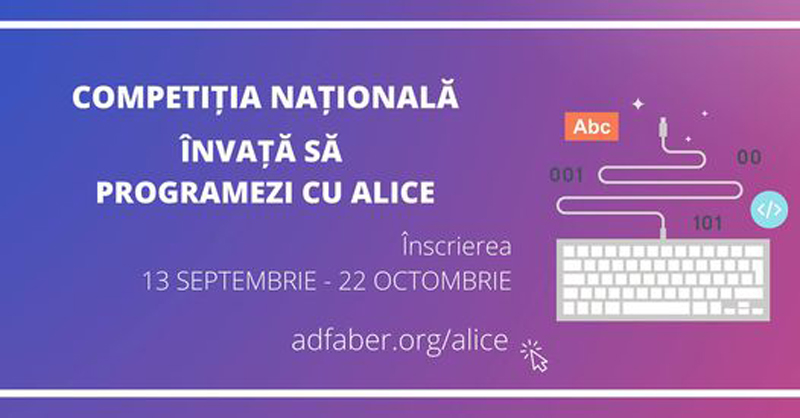 Competiția națională ,,Învață să programezi cu Alice”, organizată de către ADFABER și sponsorizată de către Oracle Academy, se află la cea de-a șaptea ediție. În fiecare an, sute de elevi pasionați de informatică participă la competiție pentru a învăța bazele programării Java într-un mod distractiv și interactiv. Pentru ediția din acest an, înscrierile sunt deschise până pe 22 octombrie. ,,Dacă ești elev în clasele V-XII și ești pasionat de informatică, ai tot ce-ți trebuie pentru a te înscrie în competiție. Fie că știi noțiunile de bază în limbajul Java sau acum faci primii pași în lumea programării, cu Alice poți crea adevărate lumi virtuale, cu personaje sau obiecte animate. Tu înveți în cel mai distractiv mod, iar noi îți vom aprecia munca și creativitatea, cu numeroase premii! Tema de anul acesta a proiectului este ,,Școala interactivă”. Dacă ai fi profesor pentru o zi, cum ai alege să predai materia elevilor tăi? Noi te provocăm să-ți pui imaginația la încercare și să transformi informațiile teoretice ale unei materii predate la școală, într-o activitate interactivă și distractivă, cu ajutorul animațiilor Alice. Poți alege să creezi fie un joc educațional, fie o lecție interactivă”, au anunțat organizatorii. La acest concurs pot participa echipe de câte 2 elevi și un mentor (profesor) din toate județele țării. Echipele se formează în funcție de ciclul educațional (un elev de gimnaziu nu are voie să facă echipă cu unul de liceu). Echipele se pot înscrie în competiție accesând https://adfaber.org/alice/. Intervalul 25 – 29 octombrie 2021 ora 23.29, este rezervat trimiterii proiectelor, prin WE TRANSFER, la adresa competitii@adfaber.org, sau sub formă de arhivă, la aceeași adresă. În urma jurizării vor fi desemnate 6 echipe câștigătoare (3 la categoria liceu și 3 la categoria gimnaziu). Câștigătorii vor fi anunțați pe 15 noiembrie.