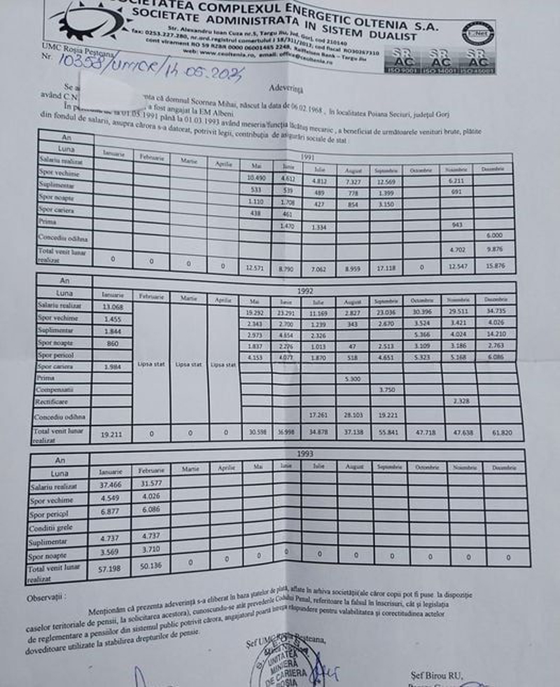 ,,Până în anul 1993, arhiva de la Albeni-Seciuri este deținută de UMC Roșia. Restul arhivei se află la Motru. De la Roșia, trebuiau să-mi elibereze adeverință din iunie 1988 până în 1993. Ați văzut în imagine ce mi-au trimis, ani și luni total lipsă, iar lunile trecute în adeverință sunt incomplete. Anumite sporuri sunt trecute într-o lună, iar în altele nu. Oricum începând cu 30.04.2024 am obținut de la instanță încuviințarea executării silite! Nu au vrut să-mi elibereze adeverințele, i-am dat în judecată, am câștigat, instanța i-a obligat să-mi elibereze documentele cerute, nu mi-au fost eliberate și am solicitat executare silită!”, a declarat Mihai Scornea. Sentința de executare silită a fost dată în data de 30 aprilie 2024.