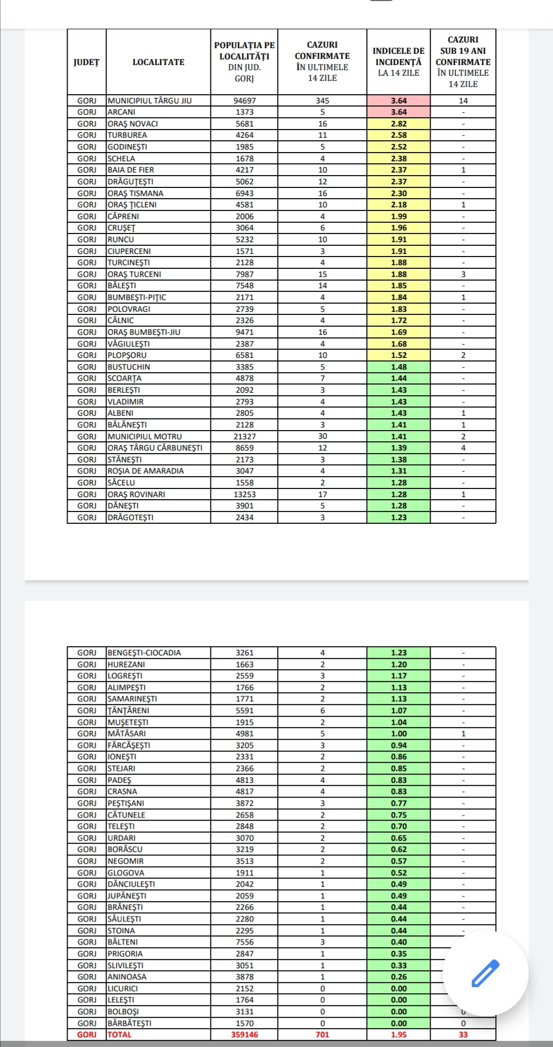 Conform ultimei situații furnizate de DSP Gorj, alături de municipiul Târgu Jiu, o altă comună din Gorj a întrat în scenariul roșu. Este vorba de Arcani care a ajuns la un indice de 3,64 la mia de locuitori.
