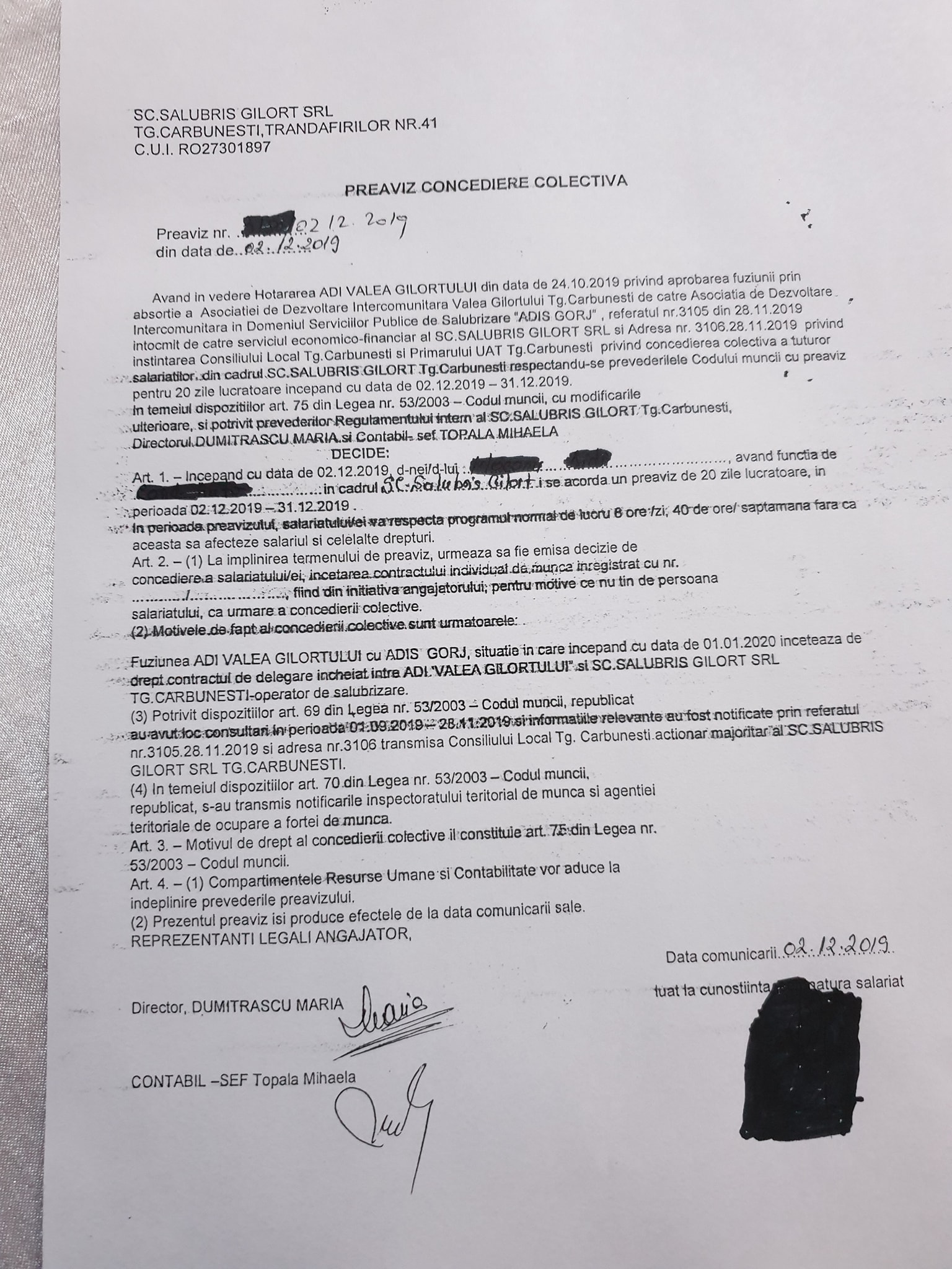 Mariana Dumitrașcu, administratorul Salubris Gilort, spune că societatea de salubritate va rămâne fără obiect de activitate, astfel că se justifică aceste concedieri. „SC Salubris Gilort era monitorizată și controlată de Asociația de Dezvoltare Intercomunitară «Valea Gilortului». ADI «Valea Gilortului», în luna octombrie, a fuzionat prin absorbție cu ADIS Gorj, în ideea că se va face la nivel de județ un operator de salubrizare, de genul Aparegio. Eu nu am niciun cuvânt de spus, e treaba primarilor care au hotărât să facă lucrul acesta. Imediat după ce s-a făcut această fuziune, urmează ca Salubris-ul să-și înceteze activitatea de drept. Nu mai avem obiect de activitate, pentru că la 1 ianuarie 2020 încetează contractul de delegare a serviciului de gestiune a deșeurilor. Nu a fost o măsură care să țină de mine”, ne-a declarat Dumitrașcu.