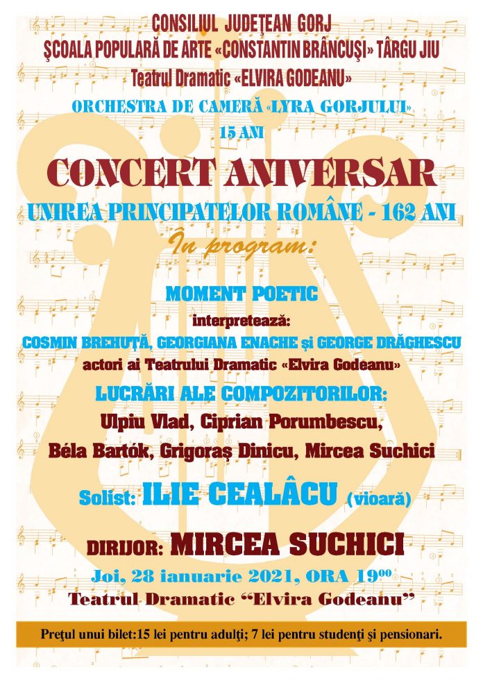Orchestra de cameră ”Lyra Gorjului” vă invită joi, 28 ianuarie 2021, ora 19:00, la Teatrul Dramatic ”Elvira Godeanu” din Târgu Jiu, la concertul aniversar – Unirea Principatelor Române – 162 de ani. Programul concertului include piese cunoscute ale compozitorilor: Ulpiu Vlad, Ciprian Porumbescu, Bela Bartok, Grigoras Dinicu, Mircea Suchici. Prețul unui bilet este de 15 lei; pentru elevi, studenți și pensionari este de 7 lei.