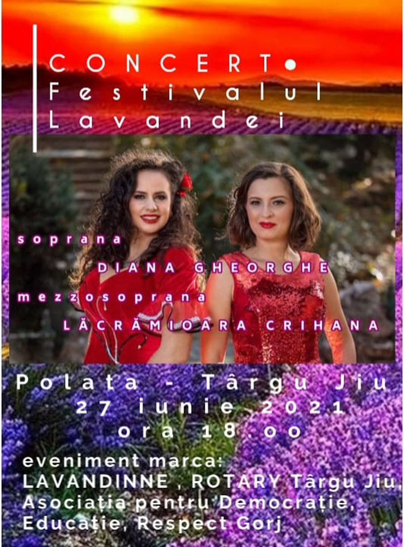 În cadrul Festivalului Lavandei ediția a-II-a, Asociația pentru Democrație Educație Respect, Lavandinne și Clubul Rotary din Târgu-Jiu organizează în data de 27 iunie 2021, la ora 18.00, un concert de muzică clasică susținut de: soprana Diana Gheorghe, mezzosoprana Lăcrămioara Crihana și baritonul Mădălin Claudiu Băban. Accesul la eveniment se va realiza pe bază de invitație, cu respectarea normelor de desfășurare a evenimentelor publice în vigoare la data respectivă. Invitații se pot obține la numărul de telefon 0757063989 sau la email: ssghimisi@gmail.com. Donația minimă este de 30 de lei și se poate face în contul RO86BTRLRONCRT0239526902, deschis la Banca Transilvania. Toate sumele atrase în urma acestui eveniment vor fi folosite pentru proiectul ,,Dăruiește pentru viitor!”, proiect prin care se dorește să se ofere copiilor din medii defavorizate, în prima zi de școală din luna septembrie, ghiozdane pline cu cele necesare unui elev.