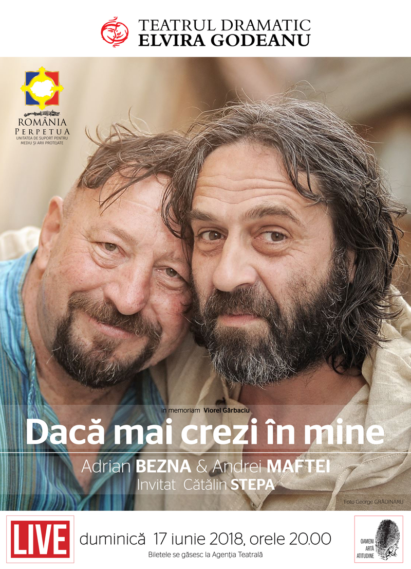 Duminică, 17 iunie 2018, de la ora 20.00, pe scena Teatrului Dramatic „Elvira Godeanu” va avea loc spectacolul „Dacă mai crezi în mine”, in memoriam Viorel Gârbaciu. Biletele pentru acest eveniment au fost deja puse în vânzare la casa de bilete a Teatrului Dramatic „Elvira Godeanu” Târgu-Jiu, preţul unui bilet fiind de 15 lei. În faţa publicului, pe scenă vor urca artiştii Adrian Beznă şi Andrei Maftei, cu invitatul special Cătălin Stepa. Concertul de muzică folk este organizat de Teatrul Dramatic „Elvira Godeanu”, cu sprijinul România Perpetuă.