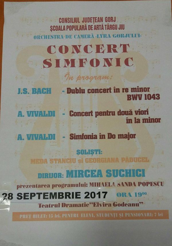 Dorind să aducă muzica clasică mai aproape de oameni, Consiliul Judeţean Gorj şi Şcoala Populară de Artă Târgu-Jiu organizează astăzi, 28 septembrie 2017, în Sala Maură a Palatului Administrativ din municipiul Târgu-Jiu, începând cu ora 19.00, un concert simfonic. Cu această ocazie se deschide şi stagiunea de concerte 2017/2018 a Orchestrei de Cameră Lyra Gorjului. Sub bagheta dirijorului Mircea Suchici, membru al Filarmonicii din Oltenia, Orchestra de Cameră va pune în valoare lucrări cunoscute ce se bucură de admiraţia iubitorilor muzicii clasice. “În program vom avea parte de piese de mare popularitate din creaţia compozitorilor: A.Vivaldi şi I.S. Bach. Preţul unui bilet este de 15 lei, iar pentru elevi, studenţi, pensionari este de 7 lei”, se arată într-un comunicat transmis de conducerea Şcolii Populare de Artă Târgu-Jiu.