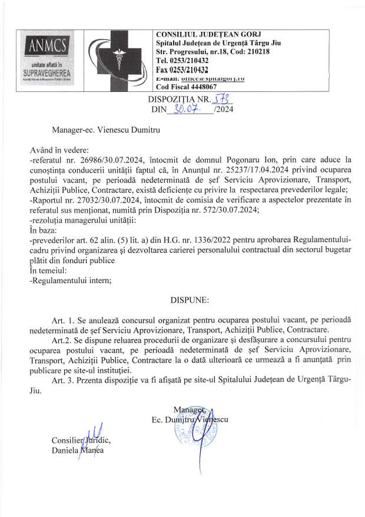 „Se dispune reluarea procedurii de organizare și desfășurare a concursului pentru ocuparea postului vacant, pe perioadă nedeterminată, de șef Serviciu Aprovizionare, Transport, Achiziții Publice, Contractare, la o dată ulterioară ce urmează a fi anunțată prin publicare pe site-ul instituției”, se arată în dispoziția dată de managerul Spitalului Județean, Dumitru Vienescu.