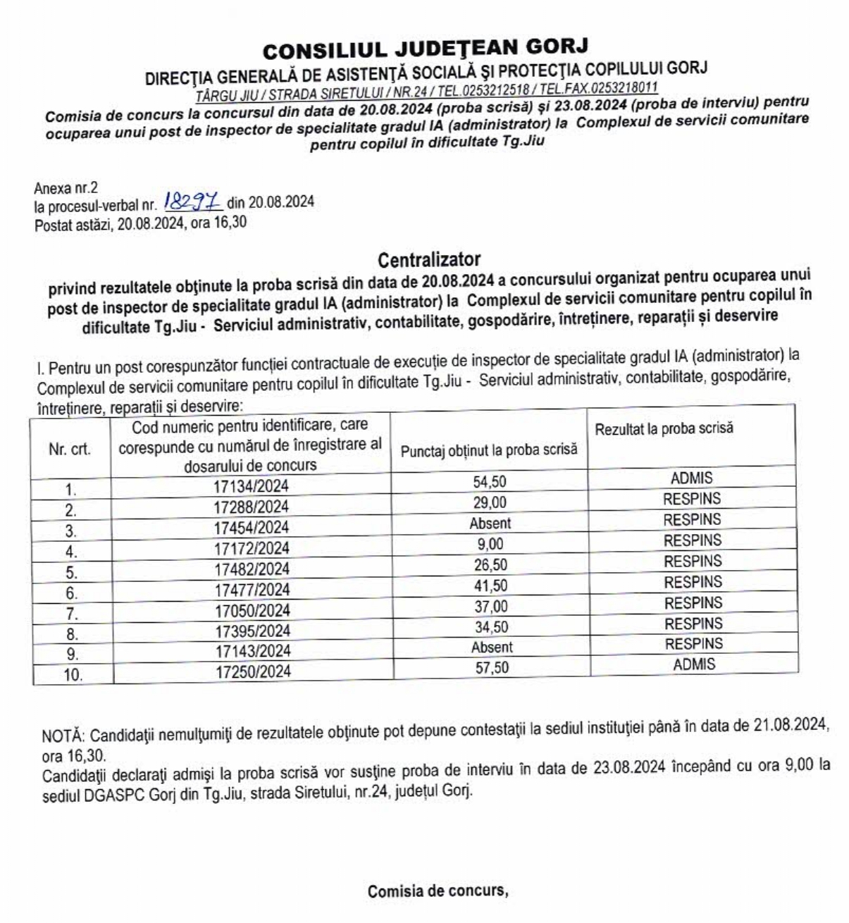 Candidații admiși au obținut 54,50 și respectiv 57,50 puncte. Aceștia vor susține proba de interviu în data de 23 august, la sediul DGASPC Gorj.