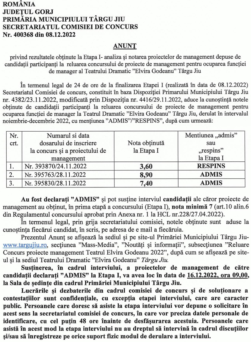 Primăria Târgu-Jiu a organizat pentru a doua oară concursul pentru ocuparea postului de manager la Teatrul Dramatic ,,Elvira Godeanu” din Târgu-Jiu. Și de data aceasta, la concurs s-au prezentat tot trei candidați, care au cerut să le fie anonimizat numele, deși vorbim de ocuparea unei funcții publice în care imaginea candidatului și calitățile sale profesionale în domeniu ar trebui să cântărească greu în fața juraților. Avem însă un concurs cu anonimi, singurul care susține că ar fi scos din cursă la proba de proiect fiind actorul Titu Eugen. Acesta susține că a obținut 3.60 de puncte la un proiect cu care a făcut furori la concursul similar de acum câțiva ani. Doi anonimi au rămas în cursă, pentru proba de interviu de săptămâna viitoare.