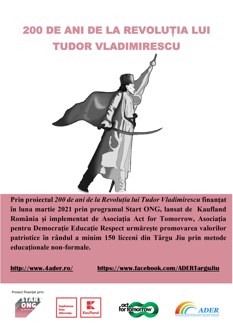 Scopul proiectului este promovarea valorilor patriotice în rândul liceenilor prin metode non-formale. Principalele obiective urmărite prin implementarea proiectului sunt: creșterea interesului elevilor pentru istoria românilor, respectarea și promovarea valorilor naționale; cultivarea imaginației și creativității elevilor în același timp cu stimularea sentimentului de prețuire a trecutului glorios al poporului român și de mândrie patriotică. Beneficiari direcți ai proiectului sunt minim 150 de elevi din clasele a IX-a – a XII-a de la liceele din municipiul Târgu-Jiu. Astfel, în perioada 5 mai -15 iunie 2021, vor avea loc două activități destinate liceenilor: Concurs de eseuri online cu tematica „200 de ani de la Revoluția lui Tudor Vladimirescu” – cele mai bune eseuri vor fi publicate într-un volum cu ISBN, Editura Thoth; Seminar interactiv desfășurat în sălile de curs ale liceelor Start ONG este un program lansat de Kaufland România și implementat de Asociația Act for Tomorrow. Domeniile vizate sunt: educație, sănătate, mediu, social și cultura. Valoarea totală a programului este de 500.000 euro. Programul Start ONG este cel mai simplificat instrument de finanțare comunitară destinat ONG-urilor tinere, instituțiilor non-administrative și grupurilor informale/ de inițiativă.