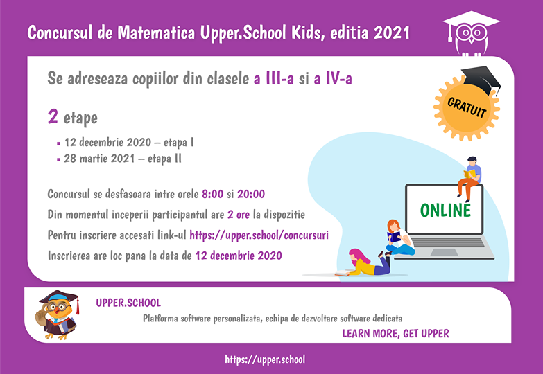 Concursul de matematică ,,Upper.School Kids” este organizat de Fundația Upper Education pentru copiii isteți, cărora le place matematica, din clasele III – IV. Competiția se va desfășura prin platforma app.upper.school și are două etape. Prima se va desfășura pe 12 decembrie, iar cea de-a doua pe 28 martie 2021. La fiecare din etape vor fi probleme cu răspuns de tip grilă și probleme cu răspuns numeric. ,,Prima etapă va avea probleme de nivel mediu, a doua etapă va avea probleme de nivel mediu – avansat. Ambele etape vor conține atât probleme din curricula școlară, cât și probleme de logică și perspicacitate. Scopul concursului este acela de a oferi copiilor din clasele a III-a și a IV-a ocazia de a-și testa cunoștințele învățate la școală, dar și logica și perspicacitatea, de a-i obișnui pe elevi cu competiții cu timp limitat, ca o pregătire pentru concursuri viitoare, și de a dezvolta interesul acestora pentru competiții de matematică, pentru a le dezvolta gândirea structurată și logica. Competiția își mai propune să verifice și să dezvolte la elevii concurenți elemente de tehnică matematică, de raționament și creativitate, adecvate vârstei, să ofere un sistem de evaluare național al nivelului și abilităților matematică, să ofere un raport pentru părinți al analizei evoluției cunoștințelor și abilităților matematice, de la Etapa 1 la Etapa 2, și o analiză a punctelor tari/slabe pe baza răspunsurilor la teste, precum și să fie distractiv pentru copii, astfel încât să-i stimuleze și să-i atragă spre matematică. Mai multe informații despre concurs și modalitatea de înscriere sunt disponibile pe https://upper.school/concursuri/.