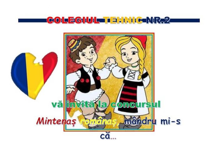 Cu ocazia zilei de 1 Decembrie, Colegiul Tehnic Nr.2 Târgu-Jiu își invită elevii să participe la un concurs de ”simțire românească”. ”Dragii noștri elevi, vă invităm astăzi la un concurs de simțire românească, cu titlul MINTENAȘ ROMÂNAȘ! Vă propunem să continuați mesajul din poza concursului, așa cum vă dictează inima voastră de români. FIȚI CREATIVI! Vă invităm să postați pe pagina de Facebook a CT2 fotografii, desene, scurte materiale video, tot ceea ce exprimă mai bine sentimentele voastre pentru România. Așteptăm cu nerăbdare lucrările voastre, până vineri, 4 decembrie!”, au anunțat organizatorii.