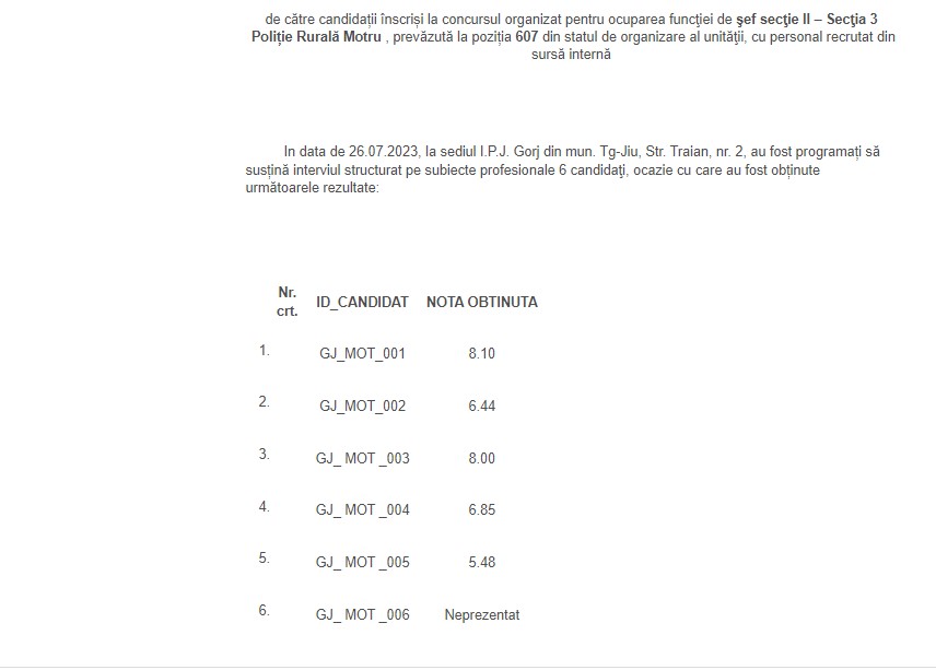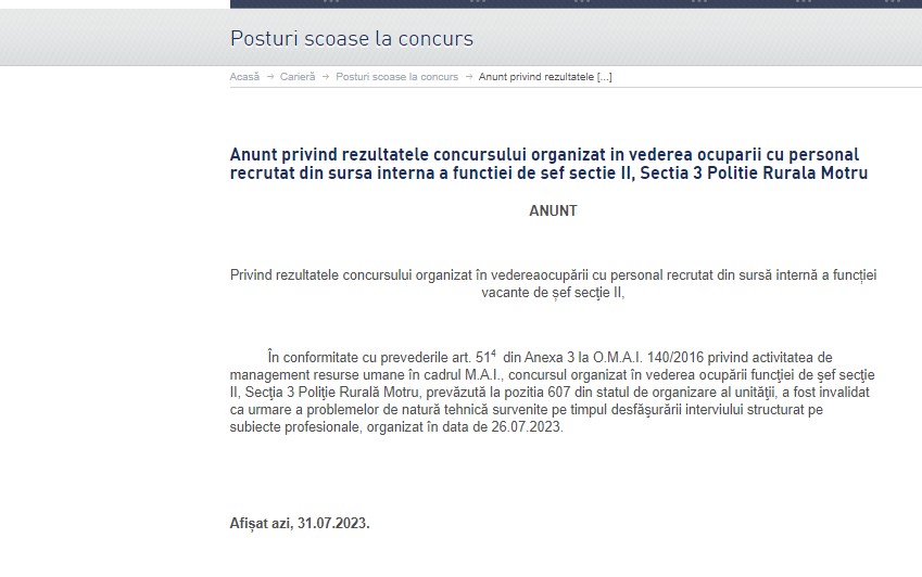 După depunerea contestațiilor, IPJ Gorj a anunțat invalidarea concursului. „În conformitate cu prevederile art. 514 din Anexa 3 la O.M.A.I. 140/2016 privind activitatea de management resurse umane în cadrul M.A.I., concursul organizat în vederea ocupării funcţiei de şef secţie II, Secţia 3 Poliţie Rurală Motru, prevăzută la pozitia 607 din statul de organizare al unităţii, a fost invalidat ca urmare a problemelor de natură tehnică survenite pe timpul desfăşurării interviului structurat pe subiecte profesionale, organizat în data de 26.07.2023”, a informat instituția.