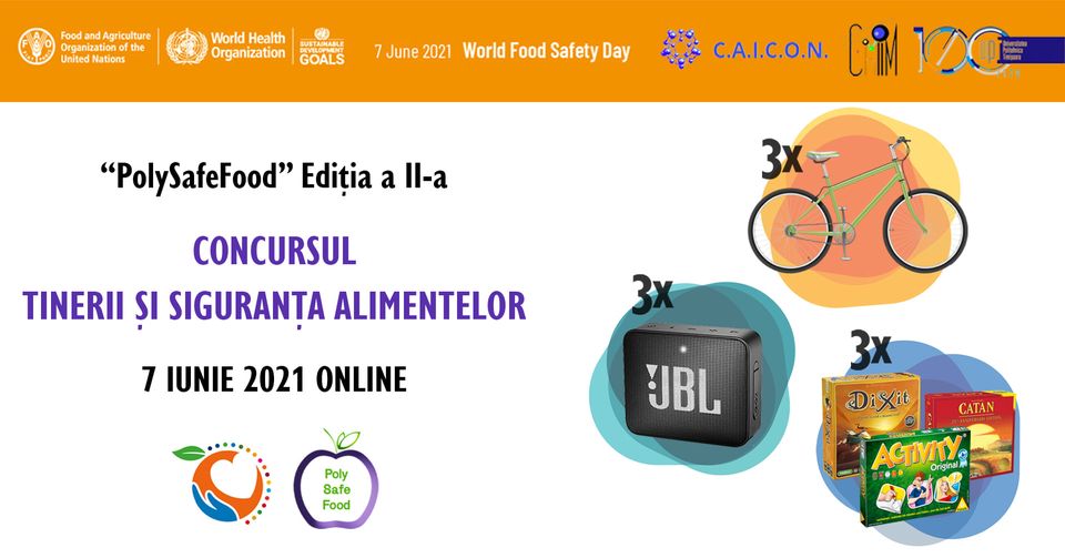 Având ca mesaj „Siguranța alimentelor este responsabilitatea tuturor” și ca temă principală “Alimente sigure pentru sănătatea de mâine”, Concursul ”Tinerii și siguranța alimentelor – PolySafeFood” se adresează elevilor, studenților și cadrelor didactice din învățământul preuniversitar și universitar. Fiind organizat cu ocazia Zilei Mondiale a Siguranței Alimentelor, prin acest concurs se dorește informarea și implicarea a cât mai multor persoane în diseminarea importanței informațiilor siguranței alimentelor și implicit a acțiunilor și măsurilor care se pot lua la nivel individual pentru a diminua riscurile asociate cu alimentele care nu prezintă siguranță pentru consum. Candidații care doresc să participe la concurs se pot înscrie prin completarea formularului de înscriere accesibil la adresa: https://docs.google.com/forms/d/e/1FAIpQLSdL5ii9hWer9zz3B148rx0wzd6DAVE757BB_oe8PjqFByZv0Q/viewform?fbclid=IwAR1FO07YbzGkor4WemxPaedEWWeD_MvyiSlbrUr1WFP6iZZ4v-VAaD-Npwc. Participarea la concurs constă în realizarea unui poster în tematica propusă folosind programul PowerPoint (în format A1) și a unei înregistrări video de maxim 5 minute în care să fie prezentat posterul de către fiecare participant elev/student. Posterul și înregistrarea video se vor trimite în intervalul 3-31 mai 2021, iar în data de 7 iunie vor fi anunțați câștigătorii pentru fiecare categorie de elevi/studenți. Organizatorii propun câte 5 teme pentru fiecare categorie de participanți: elevi clasele V-VIII, elevi clasele IX-XII și studenți. Pe lângă premiile oferite în cadrul competiției, elevii de liceu care se vor clasa pe locurile I, II și III vor fi admiși fără concurs de admitere pe locurile fără taxă (bugetate) la Facultatea de Chimie Industrială și Ingineria Mediului – domeniul Ingineria Produselor Alimentare din cadrul Universității Politehnica Timișoara, începând cu sesiunea de admitere 2021. Mai multe detalii sunt disponibile la adresa: https://chim.upt.ro/ro/evenimente/concurs-polysafefood.