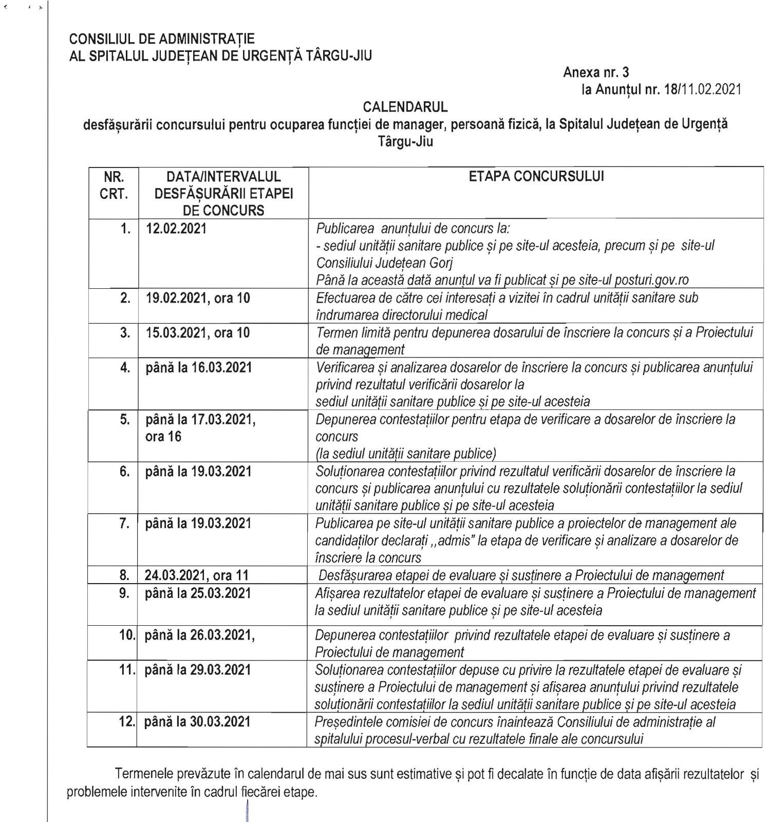 Consiliul de Administrație al Spitalului Județean de Urgență Târgu-Jiu organizează, în perioada 15-29 martie, concurs pentru ocuparea postului de manager, persoană fizică, al SJU Târgu-Jiu, unitate sanitară al cărei management a fost transferat Consiliului Județean Gorj. Postul de manager este ocupat interimar de economistul Dumitru Vienescu, din decembrie 2019.