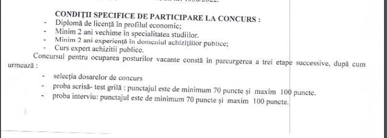 Concret, nu au fost precizate în mod clar condițiile referitoare la studii, în anunț menționându-se doar că este nevoie de „diplomă de licență în specialitatea postului”. În plus, se cerea 2 ani vechime în specialitatea studiilor.