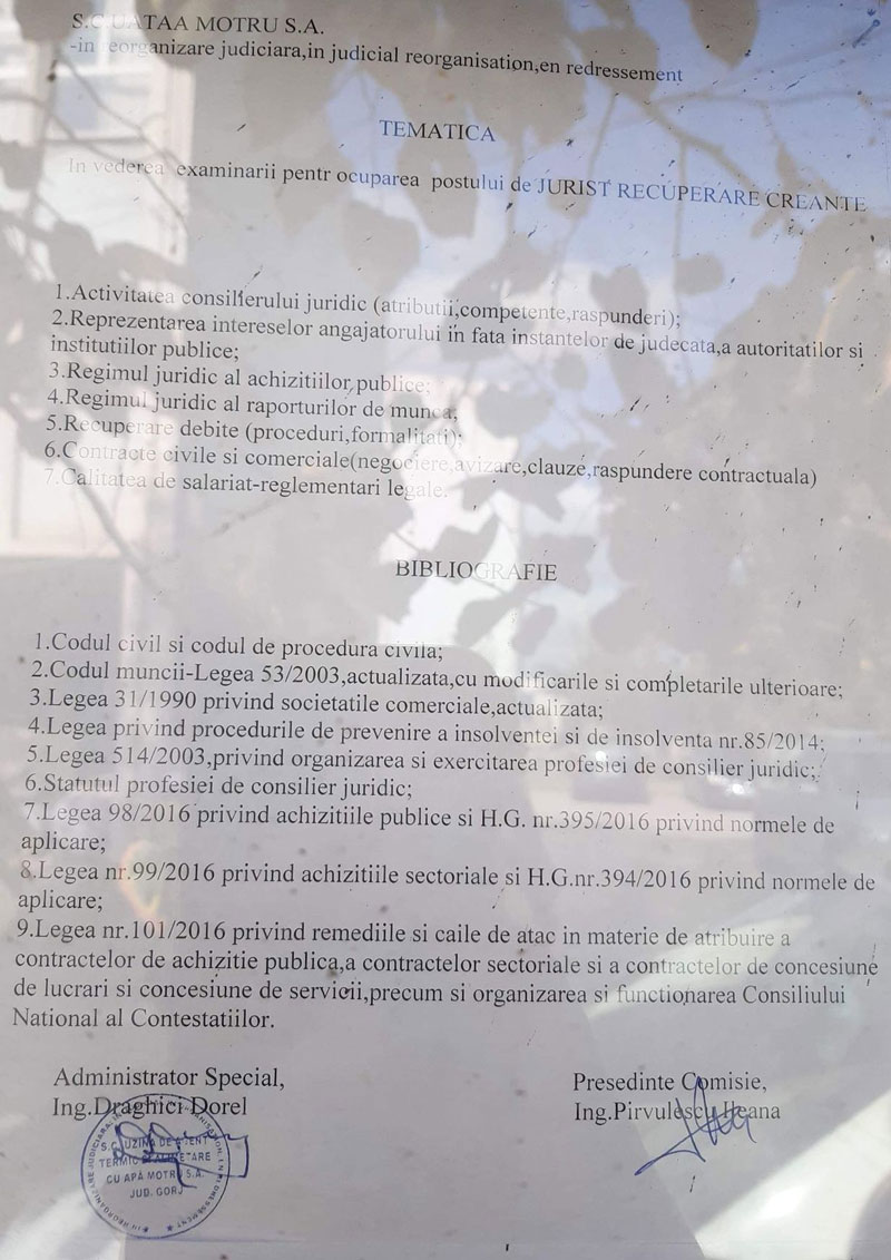 UATAA Motru va organiza, astăzi, concurs pentru postul de jurist, funcție pentru care candidează o singură persoană. Mai exact soția fostului consilier personal al primarului Jianu, Dan Matei. Directorul UATAA este liberal.Concursul pentru postul de jurist al UATAA Motru este unul controversat.