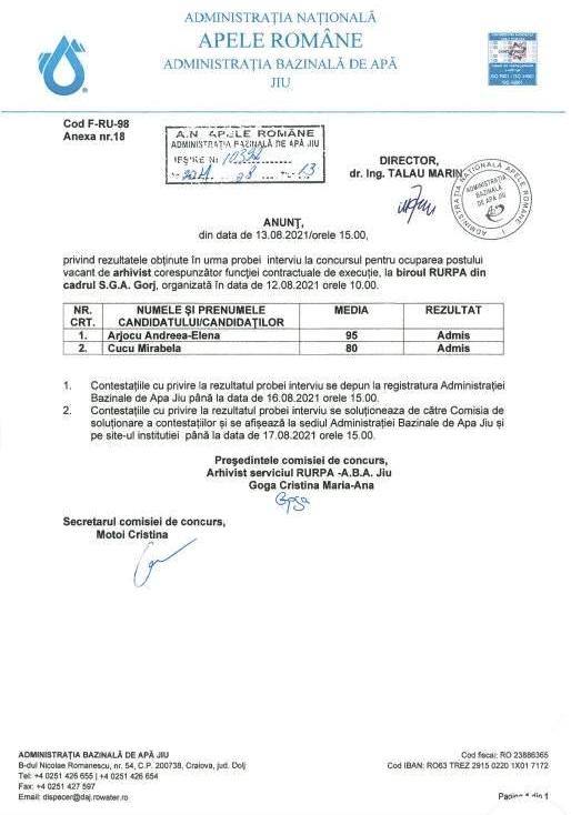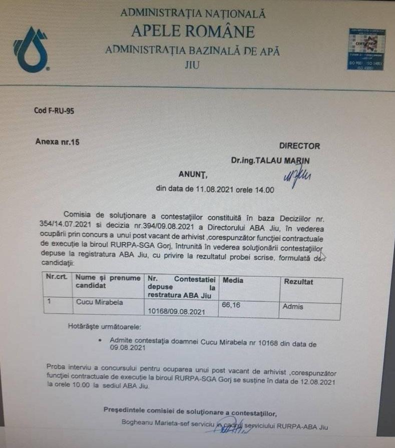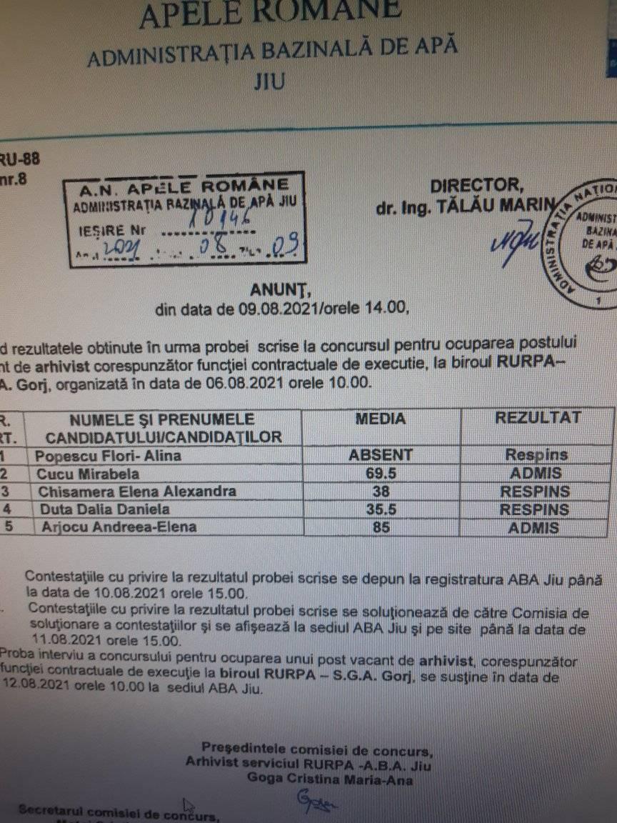 Arjocu Andrea Elena, nevasta liderului de sindicat din cadrul Serviciului de Gospodărire a Apelor Gorj, a obținut postul de arhivist scos la concurs de A.N Apele Române – Administrația Bazinală de Apa Jiu. Deși nevasta lui Arjocu a avut concurență pe post, aceasta a obținut cel mai mare punctaj, atât la proba scrisă, cât și la cea de interviu. Contracandidata soaței lui Marius Arjocu a contestat, de altfel, rezultatul obținut la una dintre probe, dar comisia de concurs i-a micșorat punctajul, nu i l-a crescut.