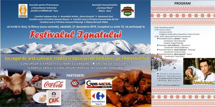 Gorjenii, dar și turiștii din întreaga țară sunt așteptați sâmbătă, 21 decembrie, la Rânca, la prima ediție a Festivalului Ignatului. Vor fi concursuri cu premii pentru talentații bucătari ai pensiunilor din zonă, un regal de gastronomie, cap de afiș fiind sarmalele cu turtă și piftii, alături de alte preparate tradiționale din porc.
