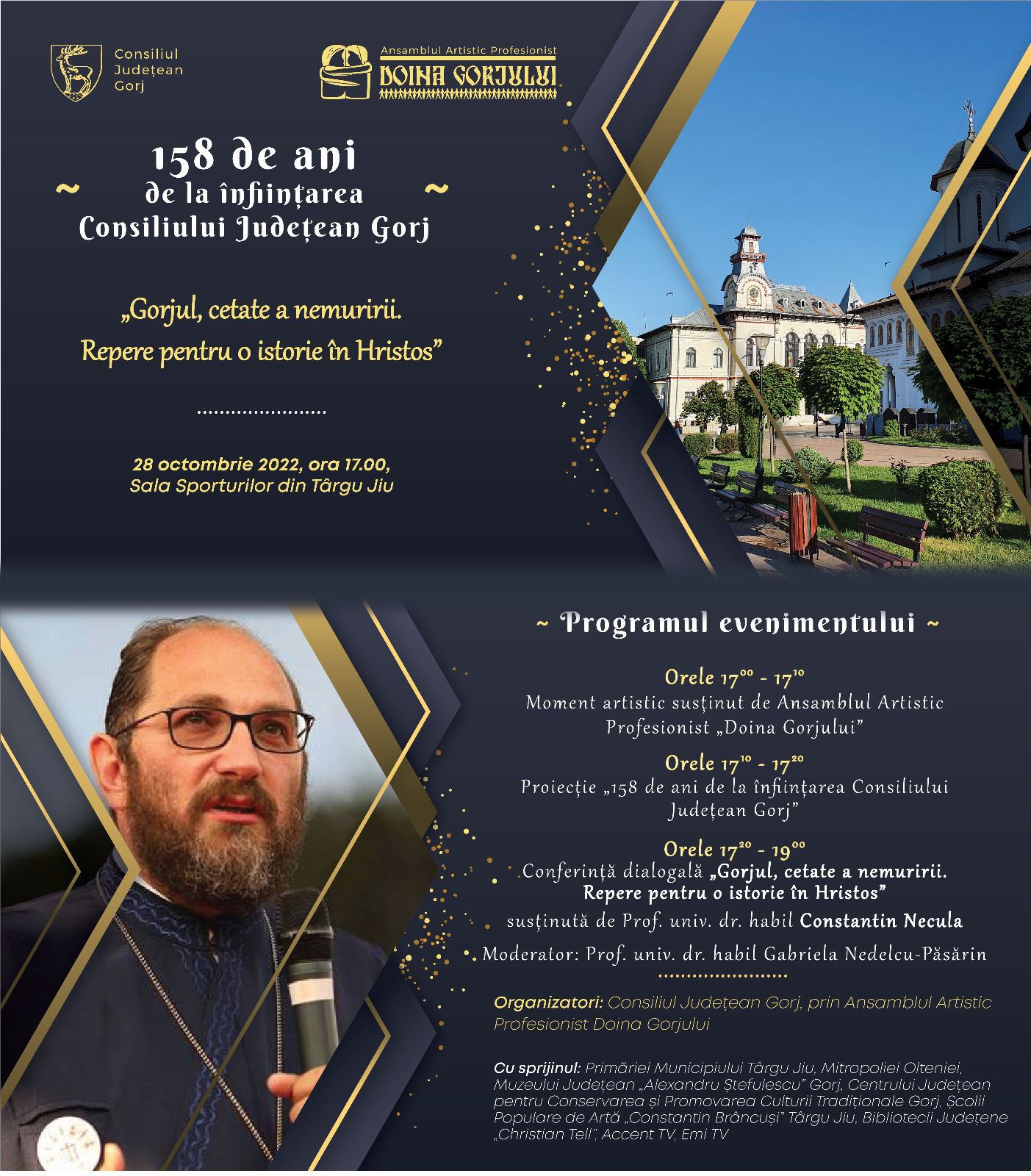 Consiliul Județean Gorj sărbătorește împlinirea a 158 de ani de existență. Cu acest prilej, autoritatea județeană organizează două evenimente festive, în semn de recunoaștere a personalităților și valorilor gorjenești, precum și ca reamintire a momentelor de început ale administrației județene, care se întâmplau în urmă cu peste un secol și jumătate.