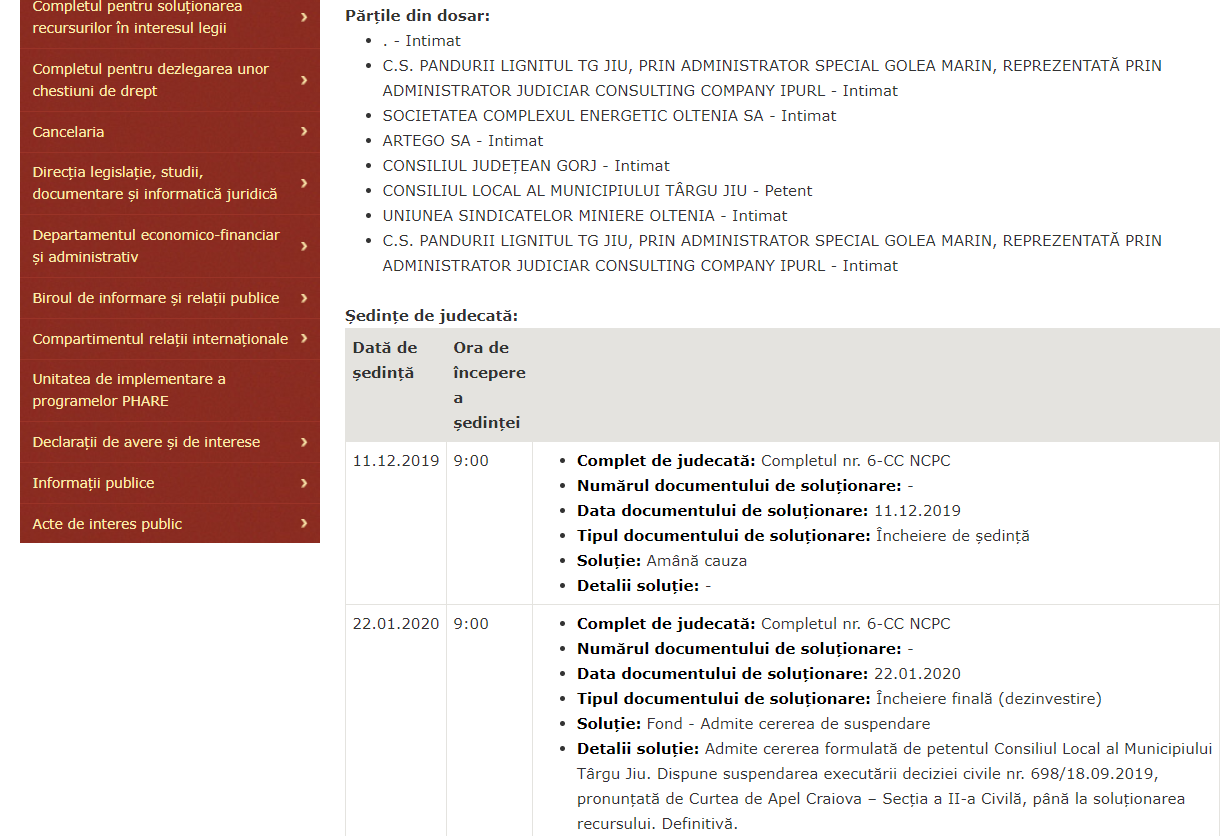 Magistrații Înaltei Curți de Casație și Justiție au admis astăzi cererea Consiliului Local Târgu-Jiu și au dispus suspendarea executării deciziei civile a Curții de Apel Craiova date în septembrie în procesul cu clubul lui Marin Condescu, până la soluționarea recursului. Practic, CS Pandurii Lignitul Târgu-Jiu nu mai poate pune poprire pe conturile Primăriei Municipiului, juriștii CL demonstrând instanței că salariile angajaților, în atare condiție, erau în pericol dar și că bugetul UAT-ului era periclitat. Marin Condescu nu poate astfel să intre în posesia banilor pe care CL i-ar fi datorat clubului de fotbal. Aceiași măsură a fost dispusă anul trecut de Înalta Curte și pentru Consiliul Județean Gorj, Artego și CE Oltenia. Sentința dată joi este definitivă.