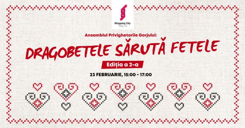 Noi ore de distracţie dedicate îndrăgostiţilor sunt pregătite pentru duminică, 23 februarie, de la orele amiezii, la mall-ul din Târgu-Jiu. Reprezentanţii unităţii organizează cea de-a doua ediţie a evenimentului „Dragobetele sărută fetele”.„Duminică, 23 februarie, eşti invitat la Shopping City Târgu- Jiu să te bucuri de spectacolul Dragobetele sărută fetele – ediția a II-a, ce va fi prezentat de Ansamblul Privighetorile Gorjului al Școlii de Canto Tradițional Târgu-Jiu, în parteneriat cu Asociaţia Culturală Cântec de pe Jiu și Clubul Copiilor Rovinari. P.S.: Pe 24 februarie, chiar de Dragobete, de la ora 16.00, echipa Liga Studenţilor Universităţii Constantin Brâncuşi vine la Shopping City Târgu-Jiu și oferă baloane simpatice și certificate cuplurilor prezente în mall”, au transmis organizatorii evenimentelor.