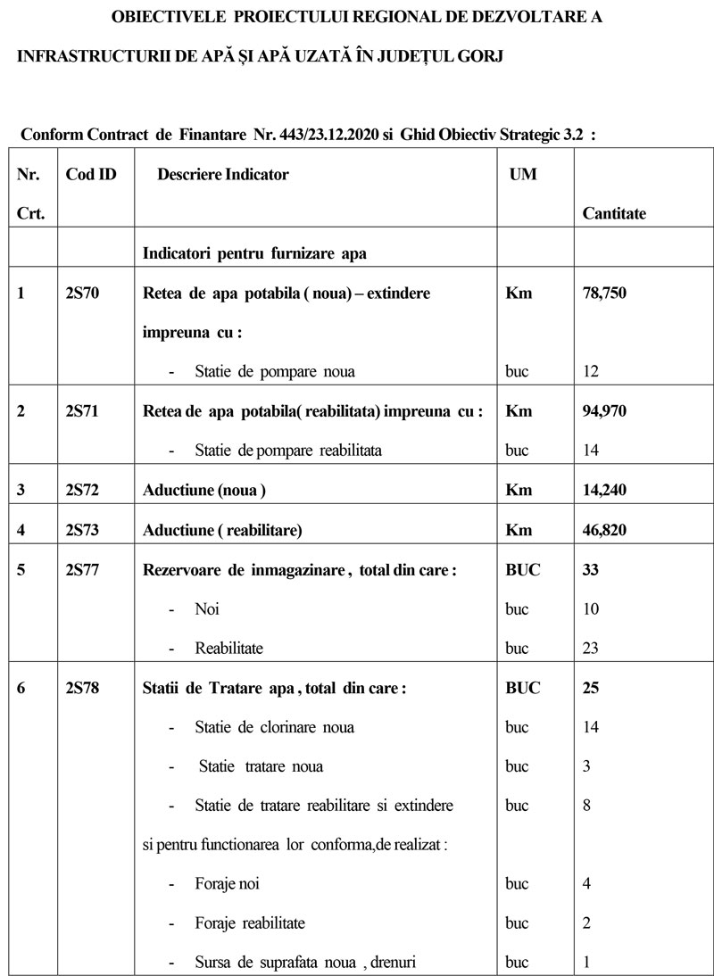 Dezvoltarea infrastructurii de mediu în condiţii de management eficient al resurselor, Obiectivul Specific 3.2. prin care se urmărește promovarea investiţiilor în domeniul apei şi apei uzate pentru îndeplinirea priorităţilor din Tratatul de Aderare referitoare la epurarea apelor uzate şi calitatea apei destinate consumului uman. Valoarea cofinanțării eligibile a beneficiarului este de 2% din partea UAT beneficiare, iar SC APAREGIO GORJ SA trebuie să acopere 6% din costurile eligibile.