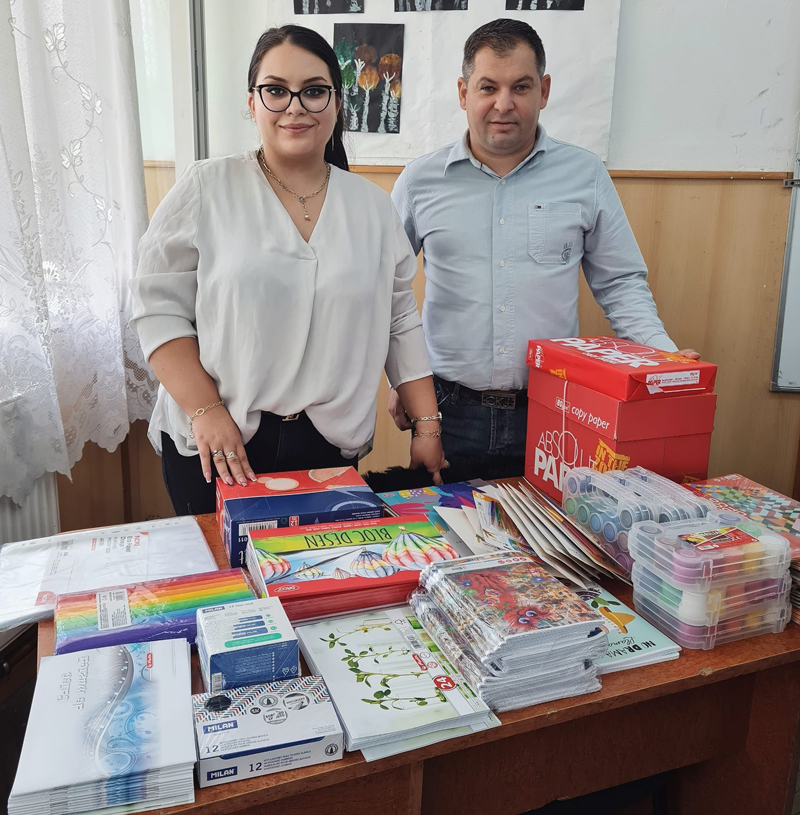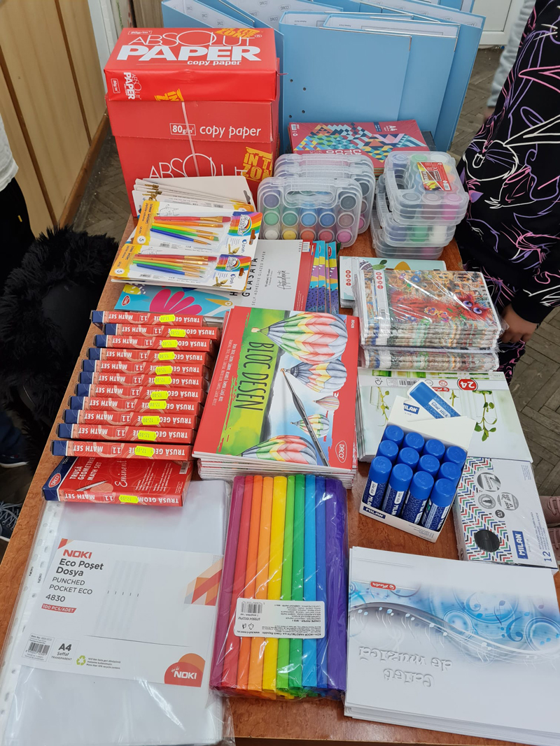 Printre bunurile aduse copiilor se numără caiete, truse geometrice, markere tablă, caiete de biologie, muzică, blocuri de desen, acuarele, pensule, lipici, bibliorafturi, cartoane colorate, coli colorate, hârtie creponată, etc.