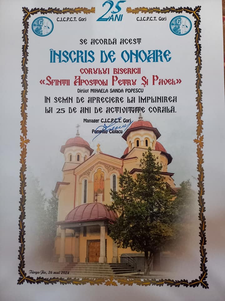 La momentul aniversar a fost prezent și dl. Pompiliu Ciolacu, directorul Centrului Județean pentru Conservarea și Promovarea Culturii Tradiționale Gorj, care a oferit din partea instituției de cultură un Înscris de Onoare pentru toți membrii Coralei ,,Sfinții apostoli Petru și Pavel”, în semn de apreciere, la împlinirea de 25 de ani de activitate corală.