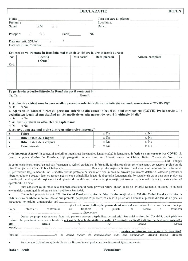 Persoanele care intră în România sunt obligate să completeze o declarație în care să spună dacă au fost în zone afectate de coronavirus, dacă au intrat în contact cu cei infectați cu COVID-19, dacă au fost spitalizate în ultimele săptămâni și dacă au febră și tușesc. Reprezentanții Inspectoratului de Poliție Județean Gorj avertizează că toți cei care mint în aceste formulare riscă închisoarea.