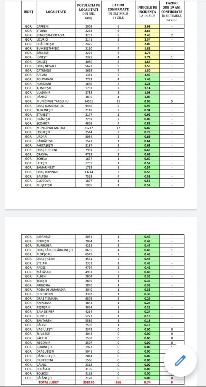COVID-19: 11 localități din Gorj, în scenariul galben