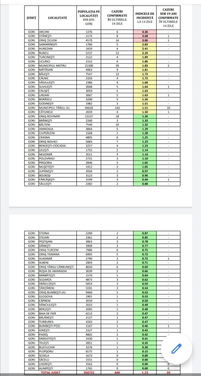 COVID-19: 3 localități din Gorj, în scenariul roșu