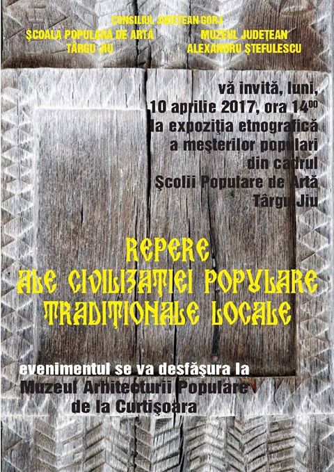 Școala Populară de Artă și Muzeul Județean Gorj ”Alexandru Ștefulescu” organizează luni, 10 aprilie, începând cu ora 14:00, la Muzeul Arhitecturii Populare de la Curtișoara, expoziția ”Repere ale civilizației populare tradiționale locale”. Cu această ocazie vor putea fi admirate creații ale meșterilor populari din cadrul Școlii Populare de Artă Târgu-Jiu.