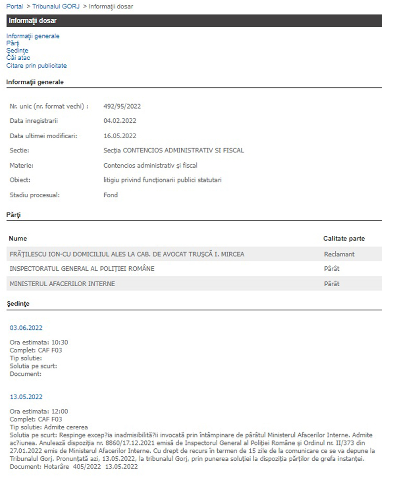 ,,Anulează dispoziţia nr. 8860/17.12.2021 emisă de Inspectorul General al Poliţiei Române şi Ordinul nr. II/373 din 27.01.2022 emis de Ministerul Afacerilor Interne”, a stabilit instanța, sentința nefiind definitivă ci cu drept de recurs în termen de 15 zile de la comunicare.