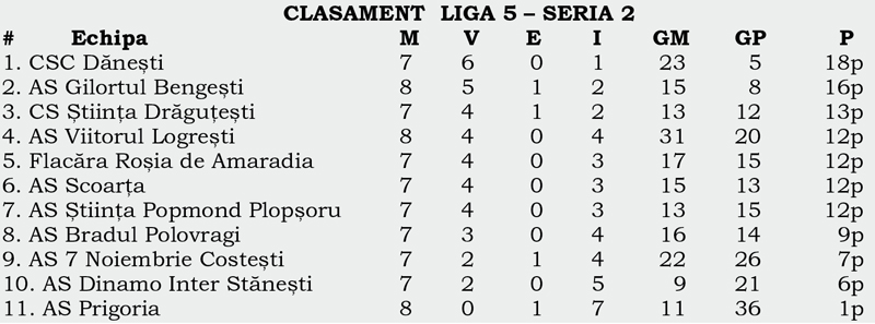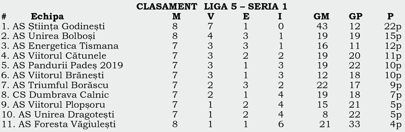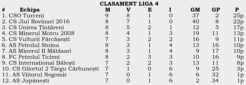 CSO Turceni este lider în Liga 4 din Gorj și are acum un avans de trei puncte față de Jiul Rovinari. Trupa lui Ion Lițoiu nu a jucat în această etapă, una ,,obișnuită” pentru campioana en-titre, care s-a impus fără probleme pe teren propriu. Băieții lui Viorel Cojocaru au câștigat la scor duelul cu Stoina și rămân neînvinși în campionat. Runda a noua a mai consemnat două remize și două victorii ale oaspeților. Cel mai clar a fost succesul motrenilor de la Negomir. Au fost goluri pe toate arenele și în cele două serii de la ,,Onoare”, acolo unde Ştiința Godinești a pierdut primele puncte pe terenul de la Borăscu. Performera etapei în Liga 5 poate fi considerată Bradul Polovragi, care a marcat de șase ori în succesul de acasă.