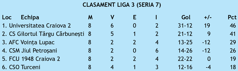 CSO Turceni a obținut primul succes al sezonului împotriva formației Gilortul Târgu Cărbunești. Cele două echipe care reprezintă Gorjul în Seria 7 a Ligii a 3-a la fotbal s-au întâlnit din nou sâmbătă. Câștig de cauză a avut de această dată formația lui Viorel Cojocaru. Gazdele s-au impus cu 3-2, într-o partidă care a contat pentru etapa a 8-a din play-out. Dubla lui Kolade Adeniji (15’, 55’) și golul lui Angel Ciutică (18’) au adus succesul pentru amfitrioni, care au o formație mult mai puternică față de anul precedent. Bogdan Dănăricu (52’) și Ionuț Gîlcescu (82’) au punctat pentru vizitatori. În absența antrenorului Mario Găman, plecat la un turneu de minifotbal în Spania, Gilortul a fost condusă de pe bancă de Bobi Staicu. Nici Marian Habet, Ulrich Siewe și Lucian Marina nu au putut fi folosiți de vizitatori. Gilortul va termina probabil pe locul 2 în play-out, după satelitul Universității Craiova. Ambele formații din Bănie au înregistrat succese halucinante în această etapă. În celelalte două partide ale rundei au fost consemnate 14, respectiv 12 goluri. Cât despre CSO Turceni, echipa ar putea evita doar ultimul loc în Seria 7. Totuși, conducerea gorjenilor a declarat că formația ar putea rămâne în Liga a treia dacă vor fi locuri “vacante”.
