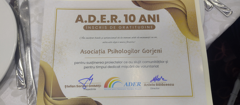 ADER – Asociația pentru Democrație Educație Respect a sărbătorit, într-un cadru aparte, 10 ani de la înființarea sa, prilej care a devenit un moment de reflecție asupra impactului acestei asociații în comunitate și de recunoștință pentru susținerea venită permanent din partea partenerilor, susținătorilor și comunității locale. ADER a fost înființată în anul 2013 cu scopul de a participa la crearea și dezvoltarea unei societăți sustenabile, de lungul acestui deceniu lucrându-se neobosit pentru a se aduce schimbări pozitive în comunitatea din municipiul Târgu Jiu, vizunea ADER fiind o societate unde fiecărei persoane îi este respectat dreptul la viață, la educație, dezvoltare și participare. Între proiectele cu impact pozitiv în comunitatea locală se află Turneul Stradivarius, Asociația pentru Democrație Educație Respect făcând posibilă aducerea la Târgu Jiu a celui mai important turneu de muzică clasică, cu participarea lui Alexandru Tomescu și a invitaților săi; Din dragoste pentru Brâncuși, un proiect destinat cunoașterii de către copiii din județul Gorj a moștenirii lăsate de marele sculptor Constantin Brâncuși; Pact pentru sănătatea mediului din Gorj, un proiect care a avut ca obiective creșterea gradului de conștientizare a comuității locale privind protecția mediului înconjurător, creșterea gradului de implicare a autorităților locale și a comunității în protecția mediului; Voluntar în Târgu Jiu, o activitate care a vizat creșterea gradului de conștientizare a tinerilor în ceea ce privește valoarea voluntariatului pentru comunitate locală, creșterea calității experienței de voluntariat și asigurarea caracterului inclusiv al voluntariatului, pe fondul schimbărilor demografice și a orientărilor valorice ale populației, precum și creșterea gradului de promovare a voluntariatului în rândul comunității locale; Pasivitatea nu oprește bullying-ul!, proiect care a avut drept principale obiective creșterea gradului de conștientizare a efectelor nocive ale acestui fenomen, prevenirea și combaterea bullying-ului. În cadrul Galei festive organizate de ADER – Asociația pentru Democrație Educație Respect au fost premiate mai multe asociații și organizații non-guvernamentale din județul Gorj ca Federația START, Association Colour Your Dreams, Organizația Națională “Cercetașii României” – filiala “Ecaterina Teodoroiu” din Târgu Jiu, Asociația DORNA Tismana, Asociația Psihologilor Gorjeni, Asociația Opportunity Club, Asociația “Arca Lex”, Asociația “Servim Comunitatea” și Asociația umanitară “Iunona”.