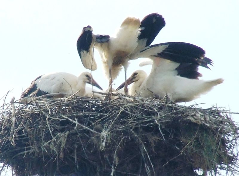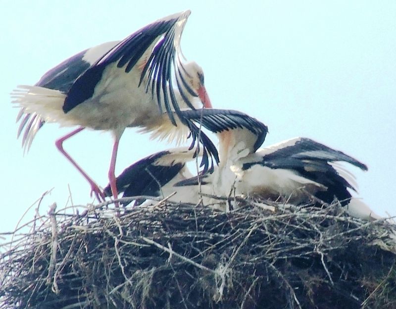 Spre surpriza mea, cuiburile în cea mai mare parte a lor erau pline de puii ce aşteptau (la ora prezenţei mele acolo) întoarcerea adulţilor de pe locurile mlăştinoase din împrejurimi (unde chiar de curând îmi exprimasem opinia că aceste înaripate îşi pot găsi facil hrana pentru ele, cât şi pentru puii care acum erau mărişori cu poftă de mâncare pe măsură). Intrând în vorbă cu nişte puşti, ce se jucau pe la porţi, am fost convins de către aceştia să mai stau puţin că urmează ca adulţii să vină să-şi hrănească puii şi o să am parte de un spectacol pe cinste. Într-adevăr nu după mult timp au venit bărzoii de la baltă probabil cu hrana îngurgitată şi au început să o împartă la puii ce până atunci stătuseră cuminţi parcă ştiind că peste puţin timp or să primească de mâncare. Trebuie să mărturisesc că am fost de-a binelea impresionat de jocul aripilor şi „toaca” din plisc a acestor simpatice păsări şi acum la sosirea în cuib în prezenţa puilor ce probabil cunoşteau ritualul adulţii au avut un program de-a dreptul mistic, ce m-a dus cu gândul la şamanii amerindieni şi incantaţiile lor ancestrale.