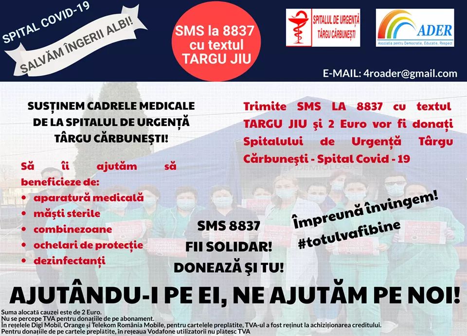 Daca vrei sa fii alaturi de personalul medical din Gorj, trimite un SMS la numarul 8837 cu textul TARGU Jiu!