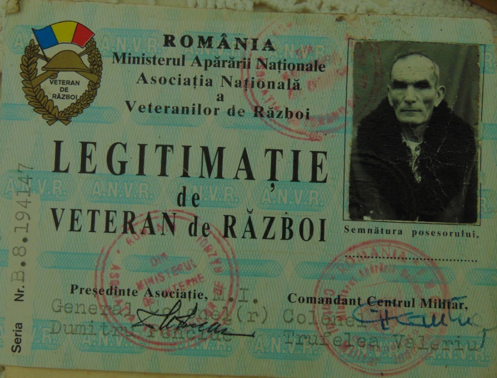 La data de 5 decembrie 1988 m-am înscris în Asociația Veteranilor de Război Antifascist de la Ministerul de Interne și am primit Legitimația de Veteran din Războiul Antifascist cu numărul 3754, semnată de gl. lt. (r.) Andrei Neagu.