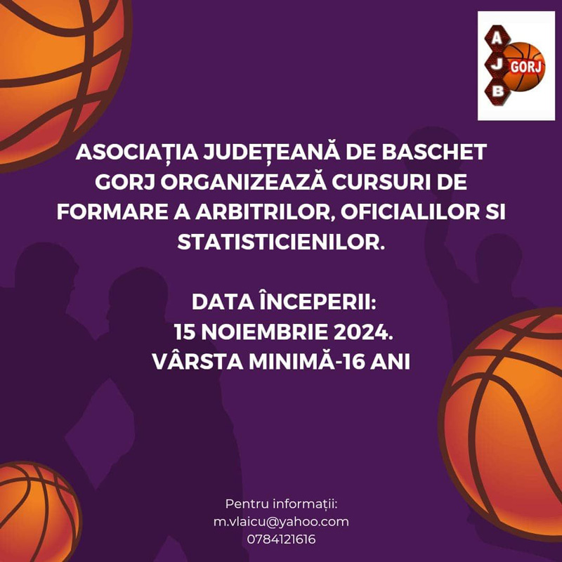 Asociația Județeană de Baschet Gorj organizează cursuri de formare a arbitrilor, oficialilor și statisticienilor. Cursurile sunt gratuite, iar vârsta minimă este de 16 ani. ,,Ai practicat baschetul și vrei să rămâi în fenomen? Sau poate vrei să vezi cum se simt meciurile mai aproape de teren? Vino alături de noi începând cu 15 noiembrie 2024 pentru a deveni arbitru, oficial sau statistician. Cursurile sunt gratuite, iar tot ce trebuie să ai este vârsta minimă de 16 ani, pasiune pentru baschet și dorința de a învăța”, a transmis pagina de facebook a Asociației.