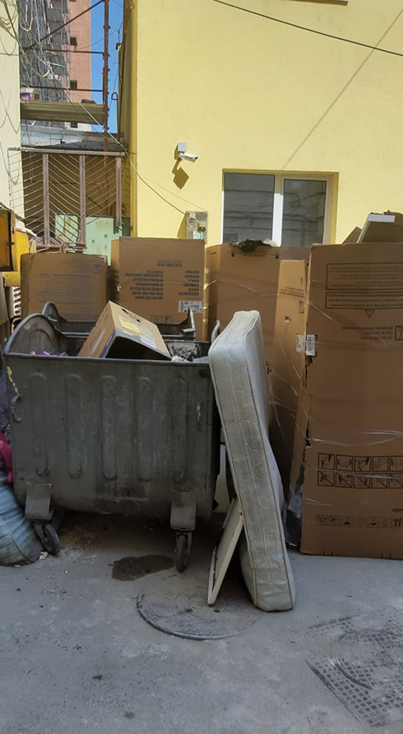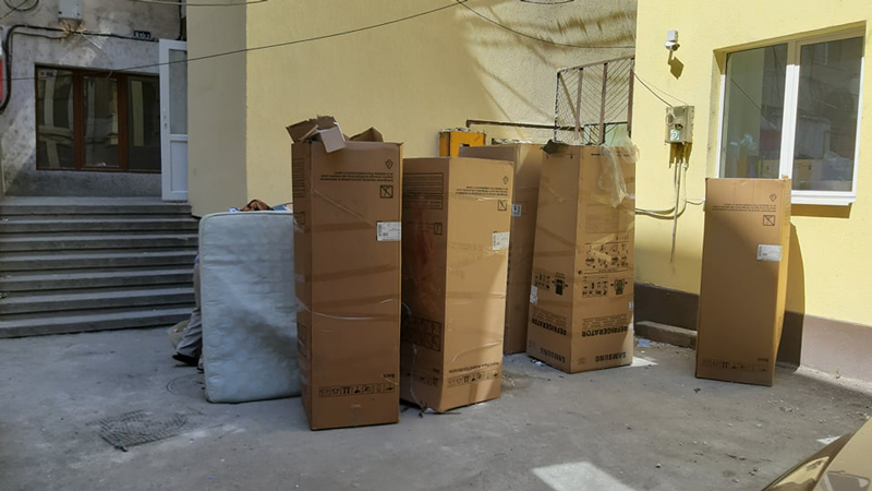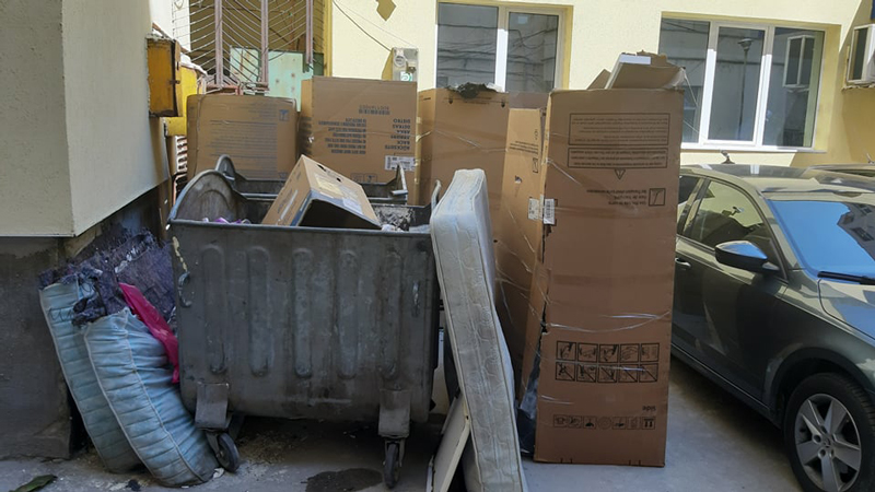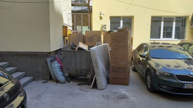 Ghenele sunt flancate de cutii mari de carton, aruncate de la magazinele de la parterul blocului, iar locatarii au depozitat acolo și niște saltele folosite.
