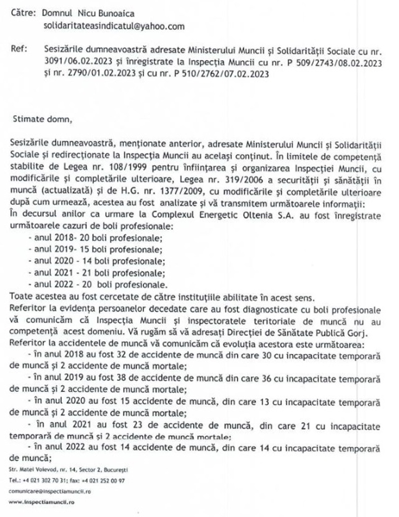 De asemenea, Inspecția Muncii i-a mai transmis liderului Sindicatului Solidaritatea 2013, Nicu Bunoaica, care a solicitate o situație în acest sens, și numărul accidentelor de muncă mortale și cu incapacitate temporară de muncă. Din 2019 și până în 2022 au murit 11 salariați, având boli grave căpătate în anii de muncă. Inspecția mai arată că din 2018 și până în prezent au avut loc 122 de accidente de muncă.