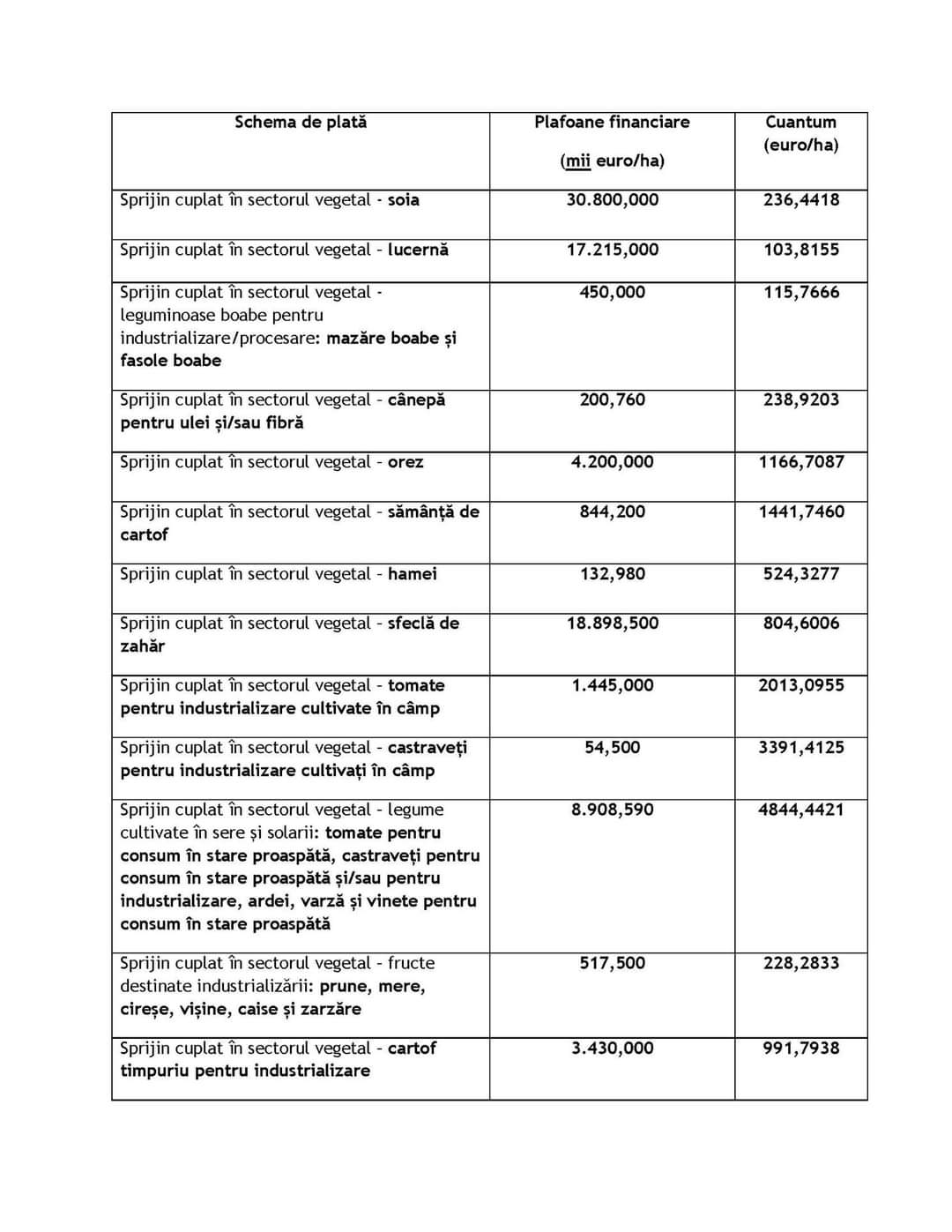 Potrivit art. 1, alin (6), din Hotărârea de Guvern nr. 492 din 28.04.2021 pentru aprobarea plafoanelor financiare alocate măsurilor de sprijin cuplat în sectorul vegetal pentru anul de cerere 2020 – “Cuantumul pe unitatea de măsură pentru fiecare măsură de sprijin cuplat în sectorul vegetal se calculează de către APIA, prin raportarea plafoanelor financiare prevăzute la alin( 5) la suprafețele eligibile pentru anul 2020”, au rezultat cuantumurile prezente în tabelul anexat.