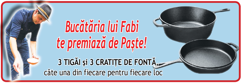 Mai trebuie să puneți puțină sare și ceva piper, să ne trimiteți preparatul vostru fotografiat pe adresele de email: publicitate@gorjeanul.ro, alinfabian62@gmail.com, dar și ingredientul folosit în plus față de rețeta originală și gata, sunteți un chef de top! Dumneavoastră dați tușa finală a desertului, iar Fabi, premiile, 3 TIGĂI și 3 CRATIȚE DE FONTĂ, câte una din fiecare pentru fiecare loc. Vă urăm succes!