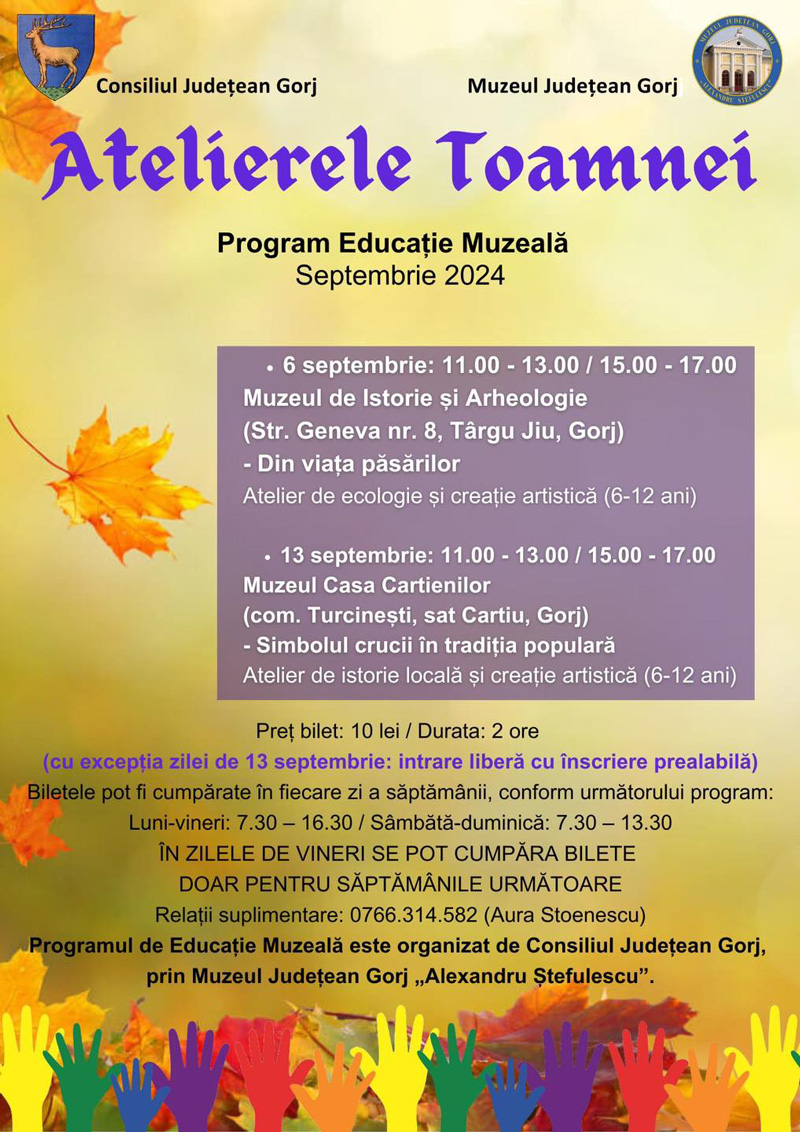 Muzeul Județean Gorj ,,Alexandru Ștefulescu” lansează de astăzi proiectul Atelierele Toamnei, care face parte din Programul de Educație Muzeală, organizat de Consiliul Județean Gorj, prin intermediul instituției de cultură. ,,Programul pentru luna septembrie este următorul: 6 septembrie: 11.00 – 13.00 / 15.00 – 17.00 – Muzeul de Istorie și Arheologie (Str. Geneva nr. 8, Târgu Jiu, Gorj) – Din viața păsărilor, atelier de ecologie și creație artistică (6-12 ani); 13 septembrie: 11.00 – 13.00 / 15.00 – 17.00 – Muzeul Casa Cartienilor (com. Turcinești, sat Cartiu, Gorj) – Simbolul crucii în tradiția populară, atelier de istorie locală și creație artistică (6-12 ani). Preț bilet: 10 lei, durata 2 ore (cu excepția zilei de 13 septembrie: intrare liberă cu înscriere prealabilă, în limita locurilor disponibile). Biletele pot fi cumpărate în fiecare zi a săptămânii, conform următorului program: luni-vineri: 7.30 – 16.30; sâmbătă-duminică: 7.30 – 13.30. În zilele de vineri se pot cumpăra bilete doar pentru săptămânile următoare”, au transmis reprezentanții Muzeului Județean Gorj.