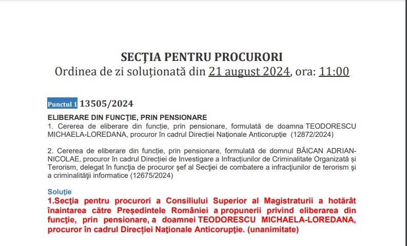 „Secţia pentru procurori a Consiliului Superior al Magistraturii a hotărât înaintarea către Președintele României a propunerii privind eliberarea din funcţie, prin pensionare, a doamnei TEODORESCU MICHAELA-LOREDANA, procuror în cadrul Direcției Naţionale Anticorupţie. (unanimitate)”, se arată în document.