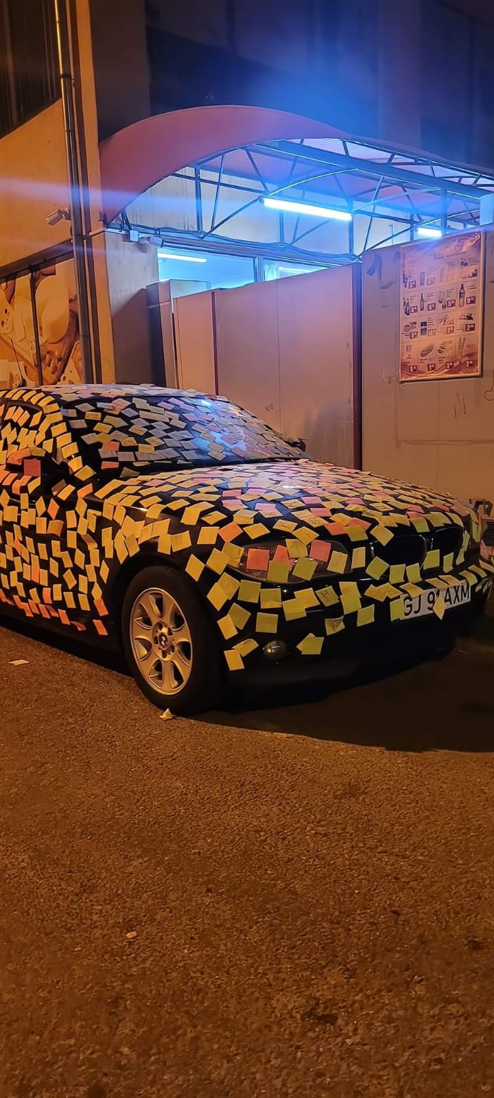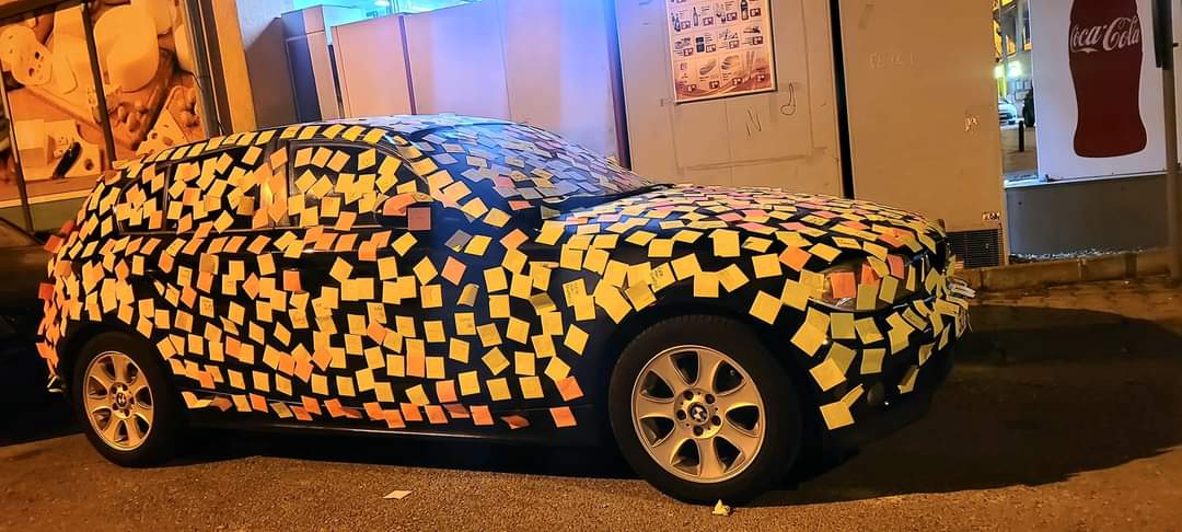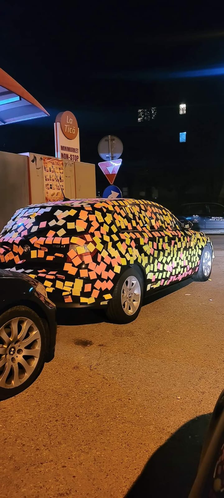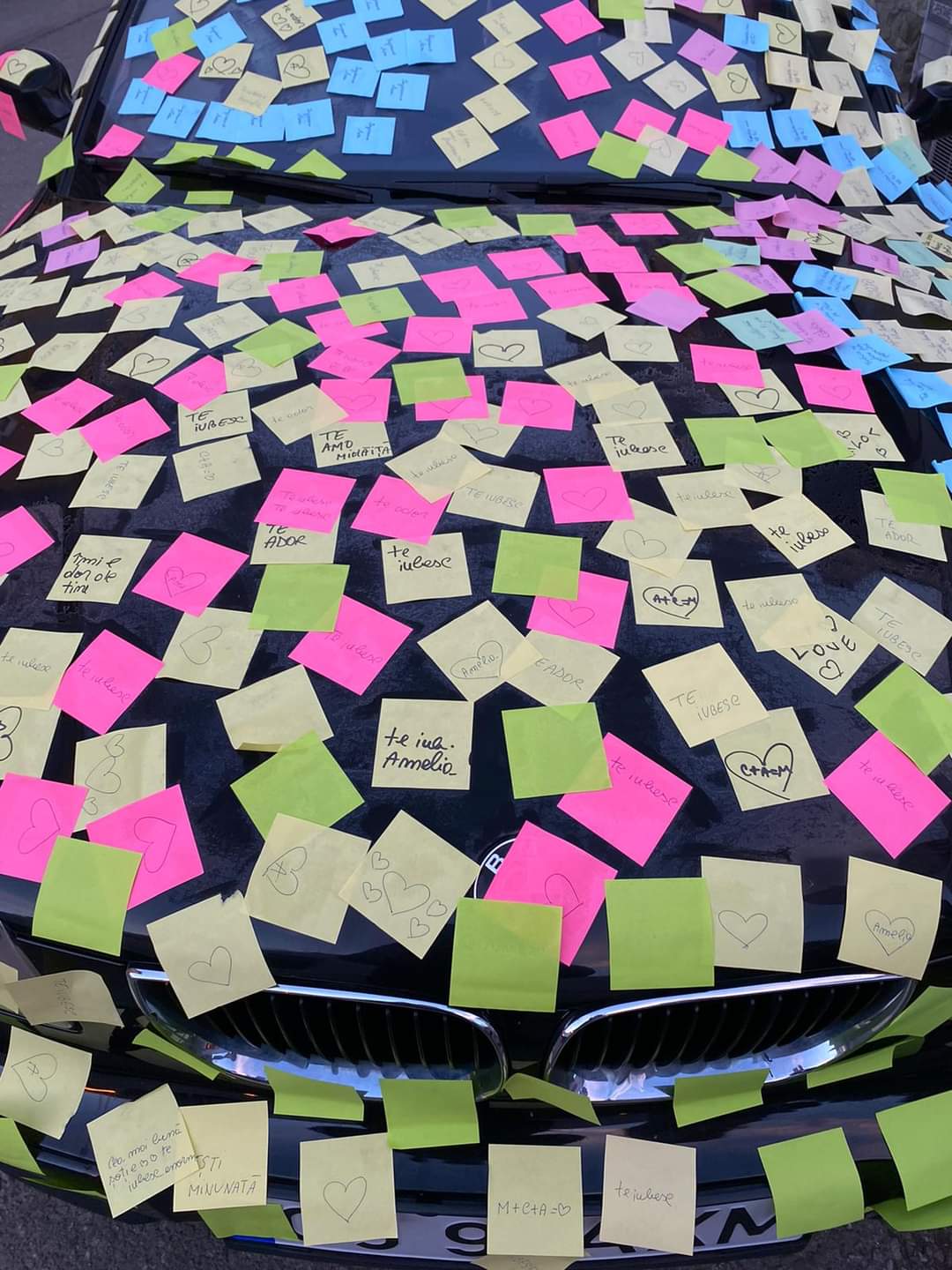 Un autoturism parcat în str. 8 Mai, din Târgu Jiu, a fost împodobit cu biletele de dragoste, astăzi, de Ziua Îndrăgostiților. Posesoarea mașinii a primit, astfel, zeci de inimioare plasate pe fiecare cm pătrat al mașinii sale. În spațiul public se vorbește despre un băiat care ar fi făcut un astfel de gest pentru a-și arăta dragostea pentru iubita sa, dar și despre posibilitatea ca un soț să-i ceară iertare, în acest mod, soției sale.