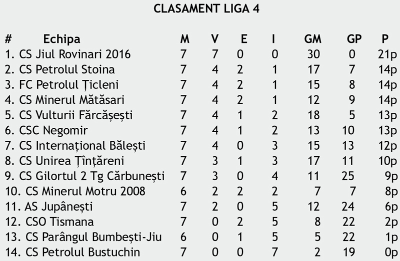Jiul Rovinari continuă să conducă detașat fotbalul județean. Trupa lui Ion Lițoiu este ,,Agentul 700” în Liga 4. Cu șapte succese pe linie, rovinărenii se pot lăuda și cu o altă performanță demnă de menționat. Nu au luat niciun gol în aproape 400 de minute. Stoina și-a pierdut invincibilitatea în deplasarea de la ,,satelitul” Gilortului, iar meciul de la Bumbești-Jiu a fost întrerupt după ce un jucător al gazdelor l-a agresat pe arbitru. Tot la Comisia de Disciplină se va decide și o partidă din Liga 5, AS Scoarța – Știința Popmond Plopşoru.