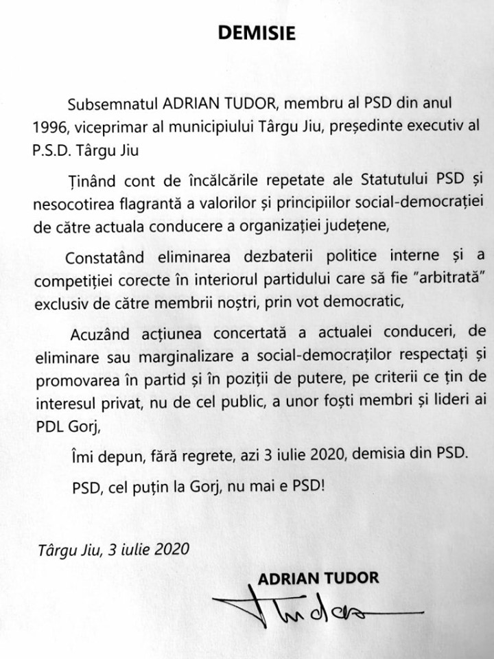 „Subsemnatul Adrian Tudor, membru PSD din 1996, viceprimar al municipiului Târgu-Jiu, președinte executiv al PSD Târgu-Jiu, ținând cont de încălcările repetate ale statutului PSD și nesocotirea flagrantă a valorilor și principiilor social-democrației de către actuala conducere a organizației județene, constatând eliminarea dezbaterii politice interne și a competiției corecte în interiorul partidului, care să fie «arbitrată» exclusiv de către membrii noștri, prin vot democratic, acuzând acțiunea concertată a actualei conduceri, de eliminare sau marginalizare a social-democraților respectați și promovarea în partid și în poziții de putere a unor foști membri și lideri PDL Gorj, îmi depun, fără regrete, demisia din PSD”, se arată în demisia lui Adrian Tudor, din 3 iulie.