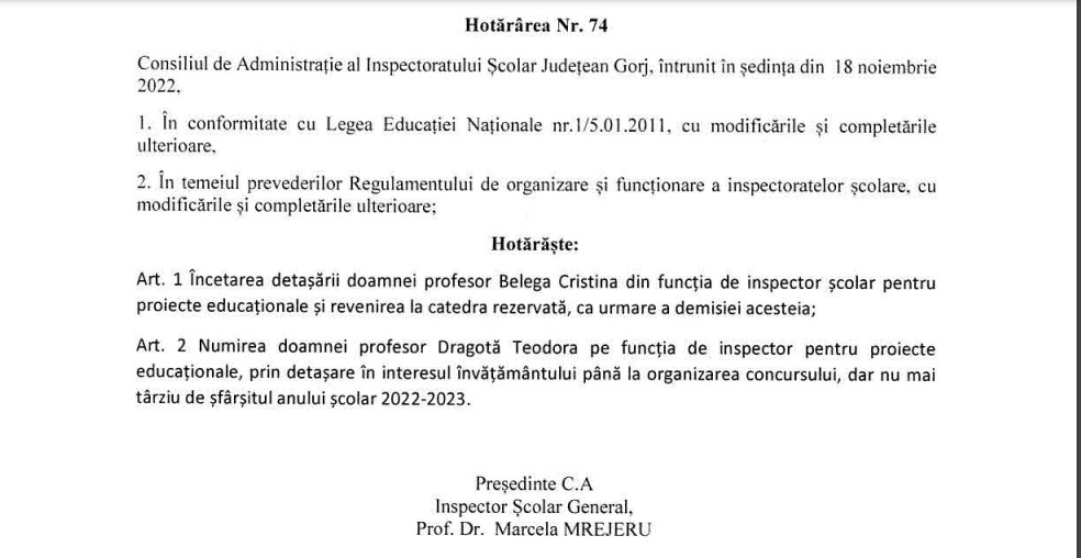Schimbări în echipa de conducere de la Inspectoratul Școlar Județean Gorj. Șefa ISJ Gorj, Marcela Mrejeru, a desemnat un nou inspector școlar pentru proiecte educaționale. Este vorba de profesoara Teodora Dragotă, de la Colegiul Național „Tudor Vladimirescu” din Târgu-Jiu. Aceasta a fost numită pe post prin detașare în interesul învățământului, până la organizarea concursului, dar nu mai târziu de sfârșitul anului școlar 2022-2023.
