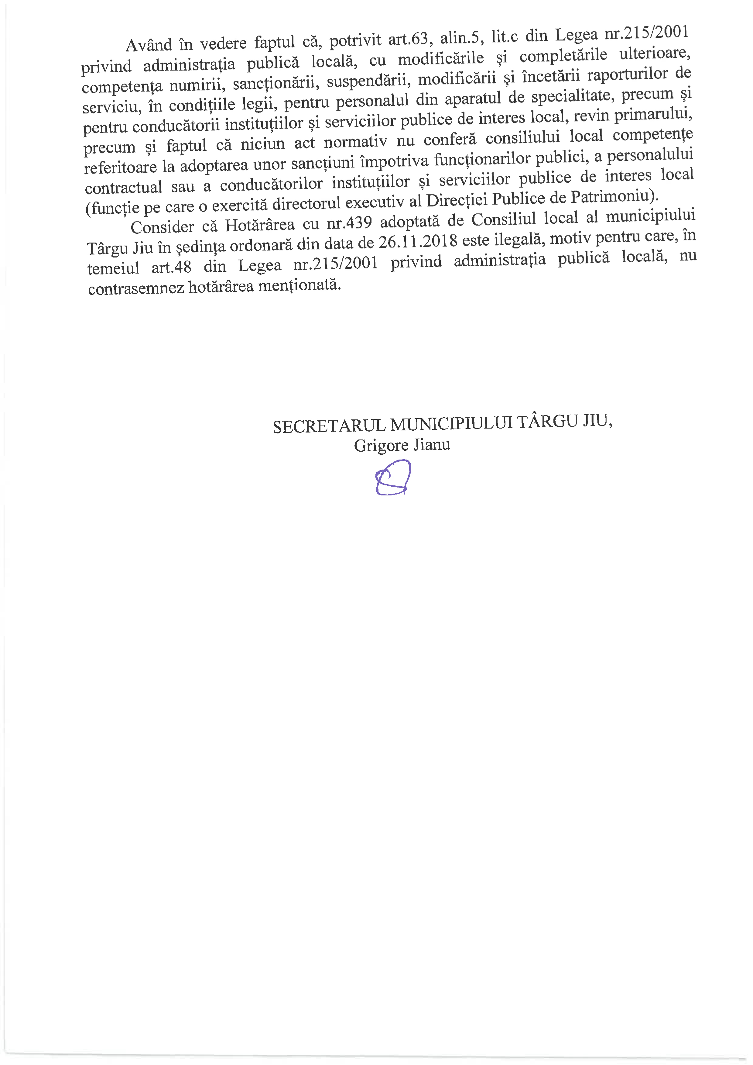 „Deși, cu ocazia dezbaterilor au fost supuse atenției consilierilor punctul de vedere al secretarului, cât și punctul de vedere al compartimentului de specialitate al primarului prin care se precizează că adoptarea proiectului este ilegală întrucât competența privind destituirea domnului Rotaru Marian din funcția de director executiv al Direcției Publice de Patrimoniu Târgu-Jiu este a primarului și nu a consiliului local, totuși s-a trecut la procedura de vot secret și s-a constatat că hotărârea a fost adoptată cu un număr de 11 voturi „pentru’’ 6 voturi „împotrivă,, și 3 „abțineri’’ din cei 20 consilieri locali prezenți din totalul de 21 în funcție. Mai mult, și din documentele comunicate, respectiv Dispoziția nr. 2341 din 16.08.2016 și Regulamentul de organizare și funcționare al Direcției Publice de Patrimoniu Târgu Jiu – Anexă la HCL nr. 213/30.05.2018, reiese că numirea și eliberarea din funcție a directorului executiv al Direcției Publice de Patrimoniu Târgu Jiu se face de către primar”, se arată în motivarea instanței de fond în luarea deciziei care îi este acum favorabilă lui Rotaru.